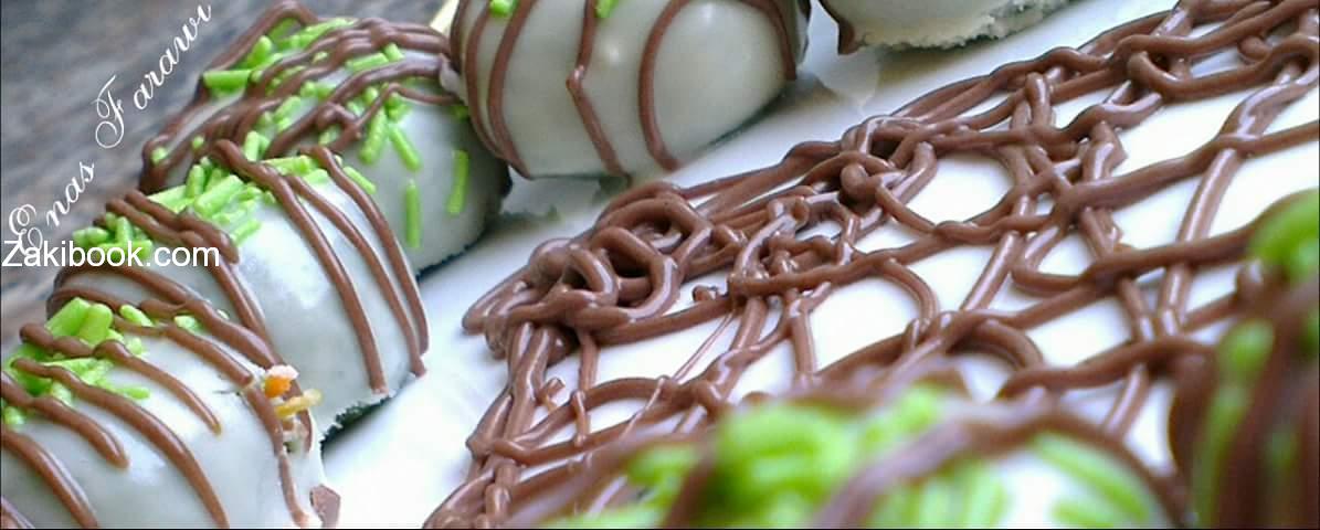 – لما نطلعها نصب نصف علبة حليب مكثف محلى ونعجنها فيه …ونشكلها دوائر أي مقاس تحبيه …ووتغمسيها بالشكولاتة البيضاء …وخطوط بالشكولاتة السوداء وبالفارمسيه الملون.