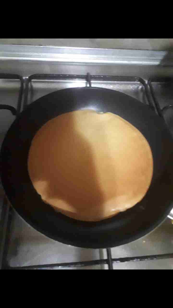 ٢.اختاري مقلاة غير لاصقة وضعيها على الغاز كي تحمى ثم ضيفي كمية من الخليط واقلبيه الى الجهة الأخرى الى انتهاء الكمية