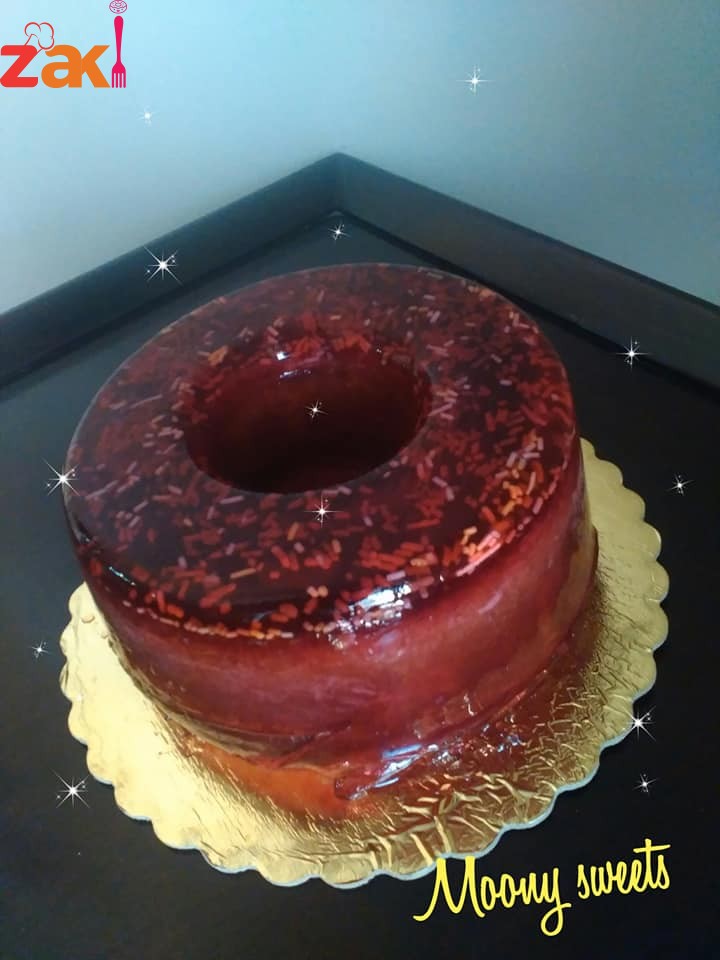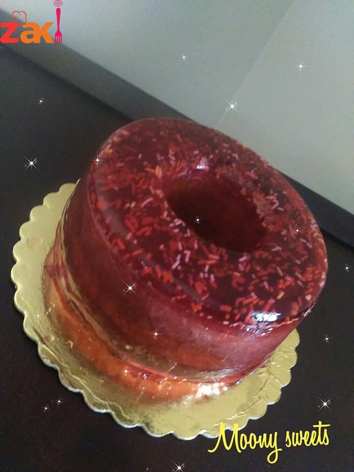 عملت كيكة بالطريقة المعتادة ولما بردت واستوت طلعتها من القالب وجليت القالب ونشفته بعدين جبت باكيت جلي نباتي ( نقطة مهمة ) عملته عادي وحطيته بالقالب ولما بلش يجمد حطيت الفراولة وحطيت القالب بالتلاجة ربع ساعة