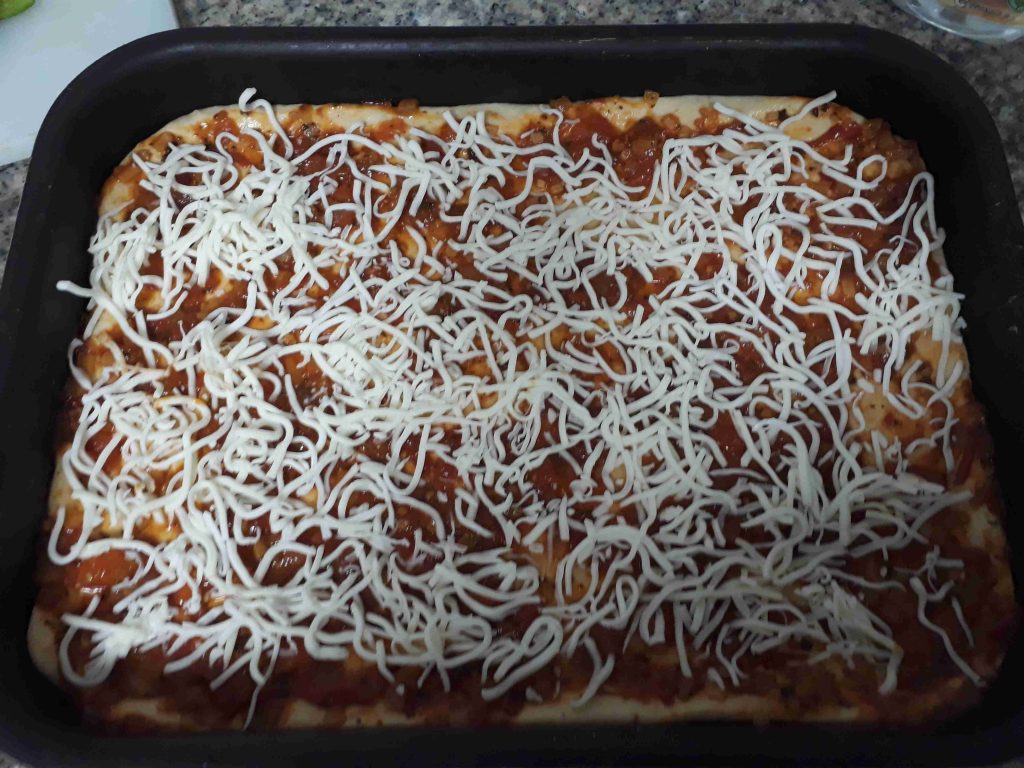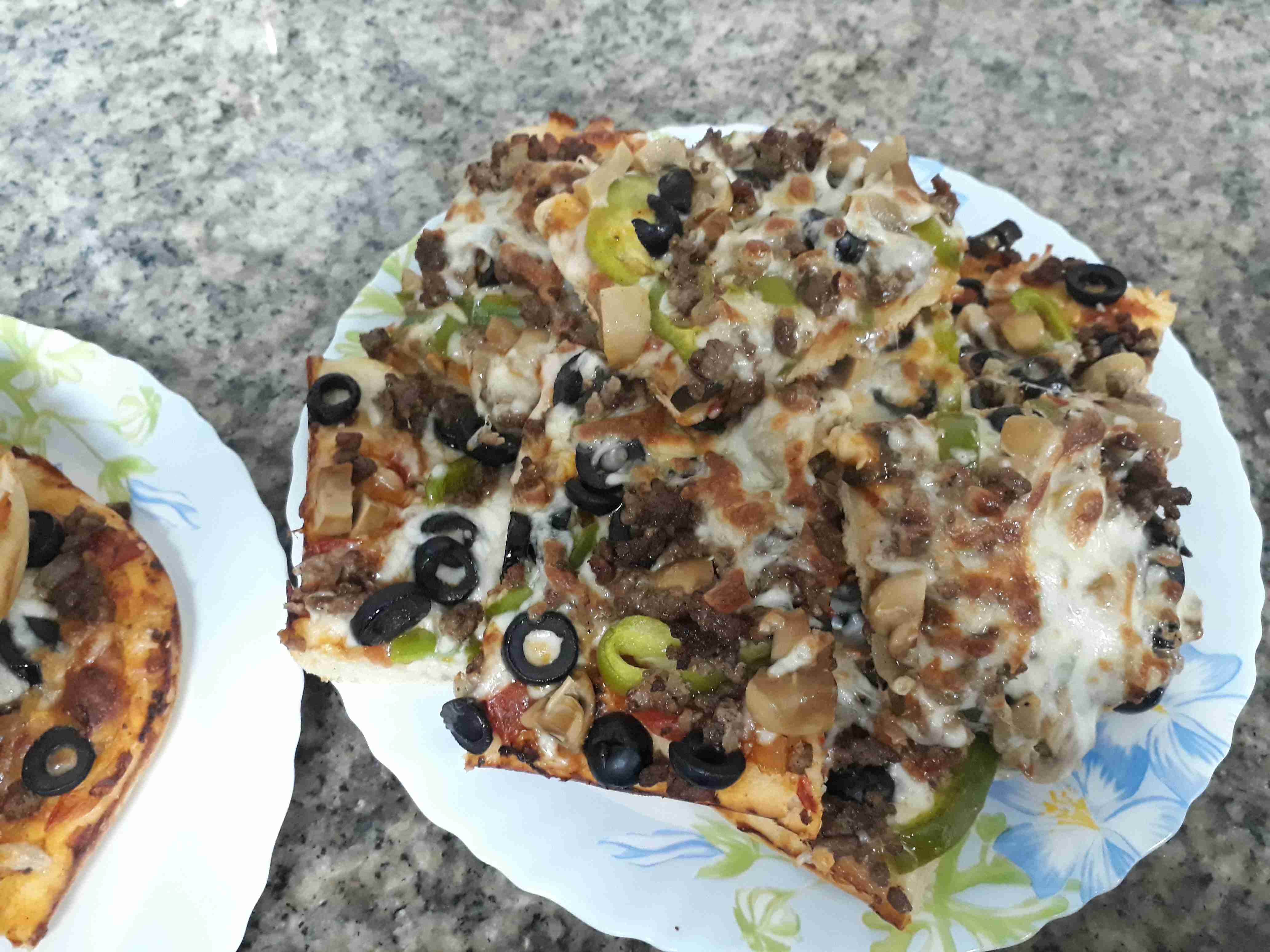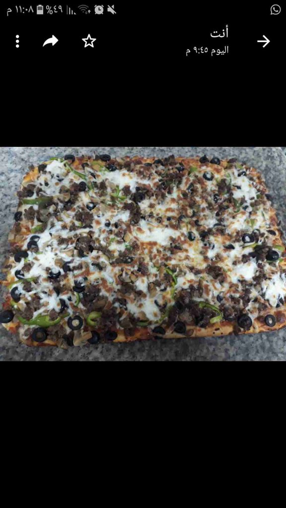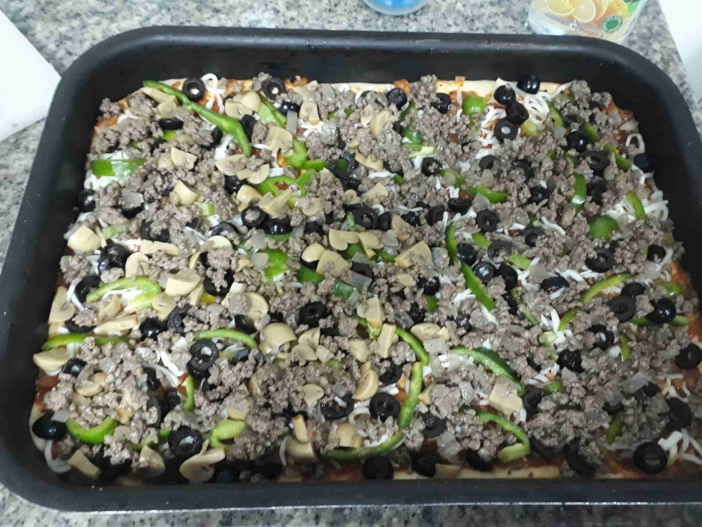 بعجن العجينه وبخليها ترتاح ساعه بعدين بفردها بالصينيه المدهونه شويه زيت وبحط صلصه البيتزا وبرش جبنه والفليفله والفطر واللحمه والزيتون وبدخلها الفرن وبس تستوي قبل ما احمرها برش باقي الجبنه وبحمرها شوي…..