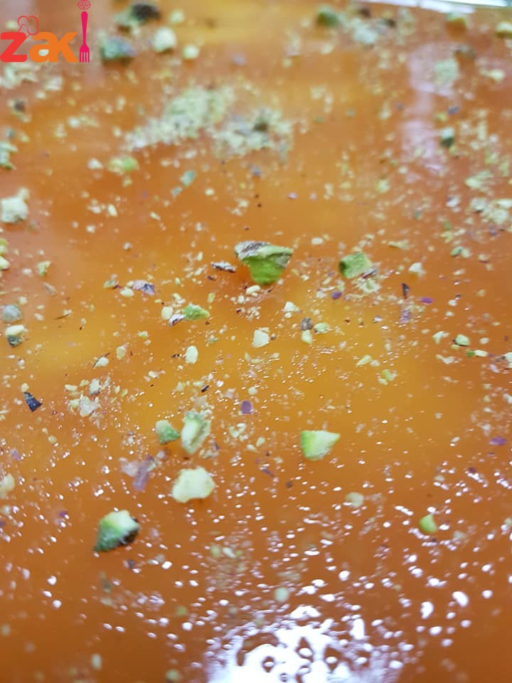 بنضيفها فوق طبقة المهلبيه وتوضع في الثلاجة وتزين بالفستق الحلبي