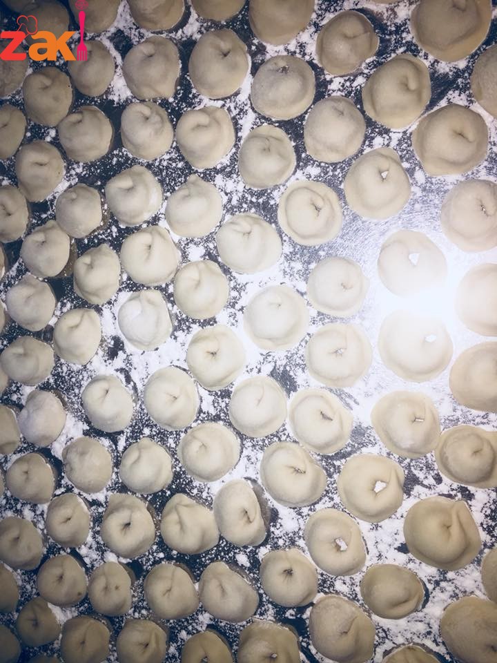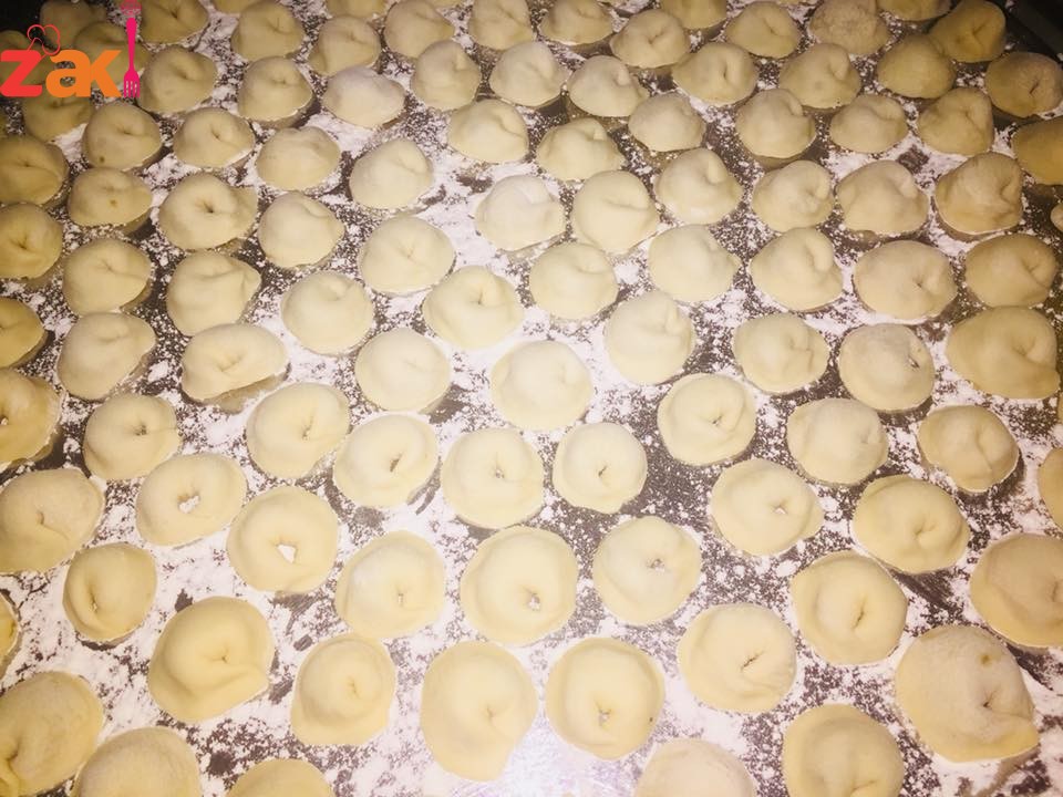 ثم نفردها ونقطعها بفنجان صغير جداً وتحشى باللحم المفروم وتغلق بشكل حبة القطايف نصف دائرة ثم نجمع طرفيها لتأخذ شكل اذان القط