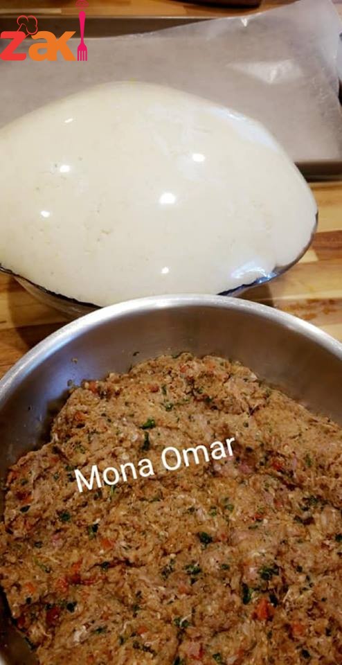 كمان بنفرد اللحم فوق العجينه بخبزها ع درجه حرارة