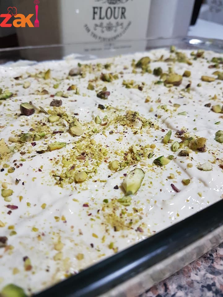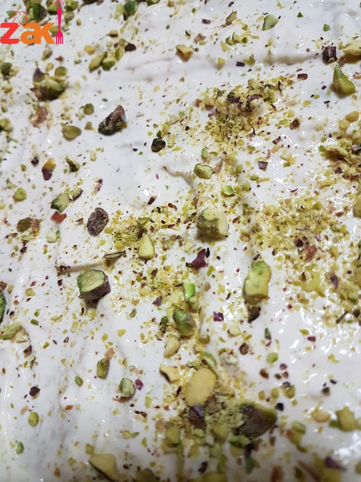 نزين الصينية بالفستق وجوز الهند وتوضع في الثلاجه لمده ساعه او ساعتين وتقطع وتقدم وبالعافيه