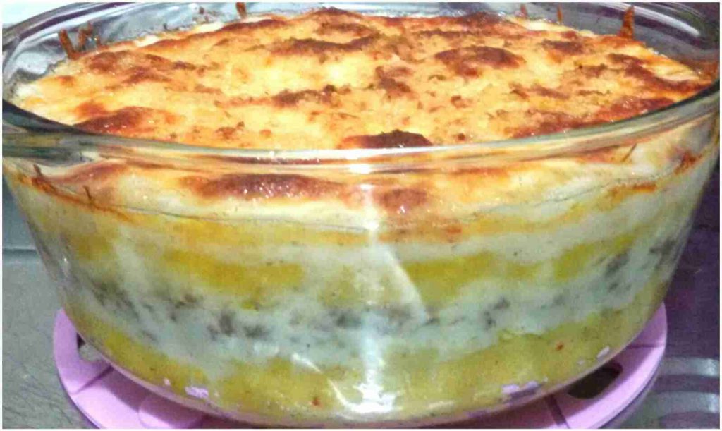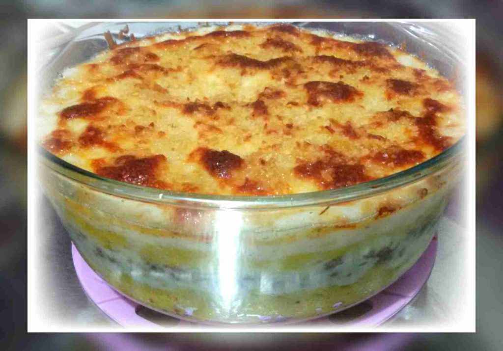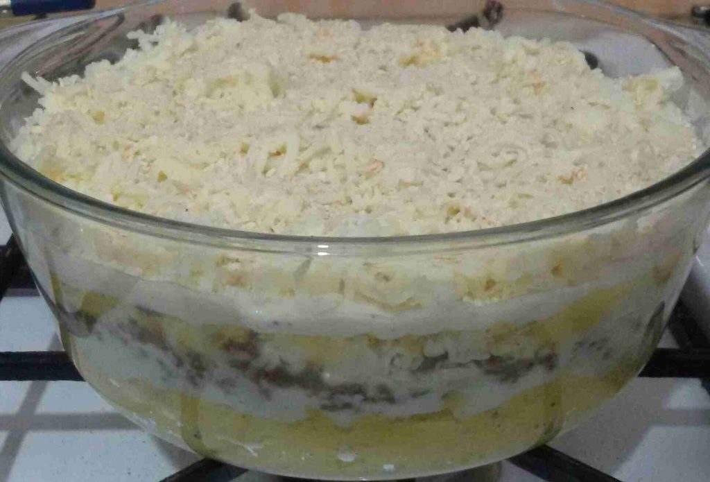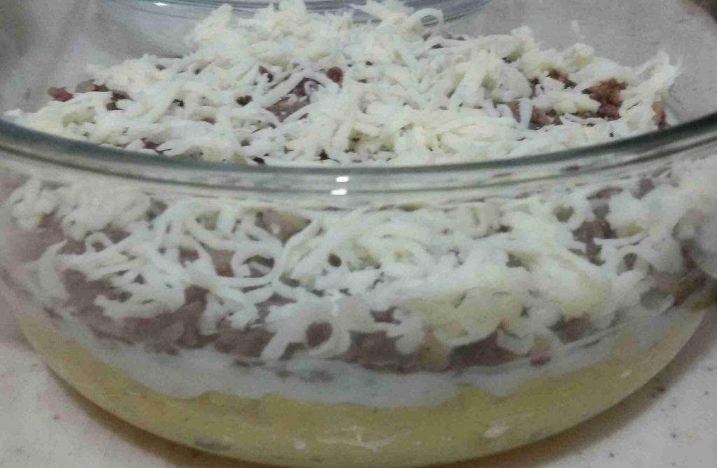 طبقة بطاطا وطبقة حشوة وطبقة بشاميل وفوقا قشقوان وبكصمات