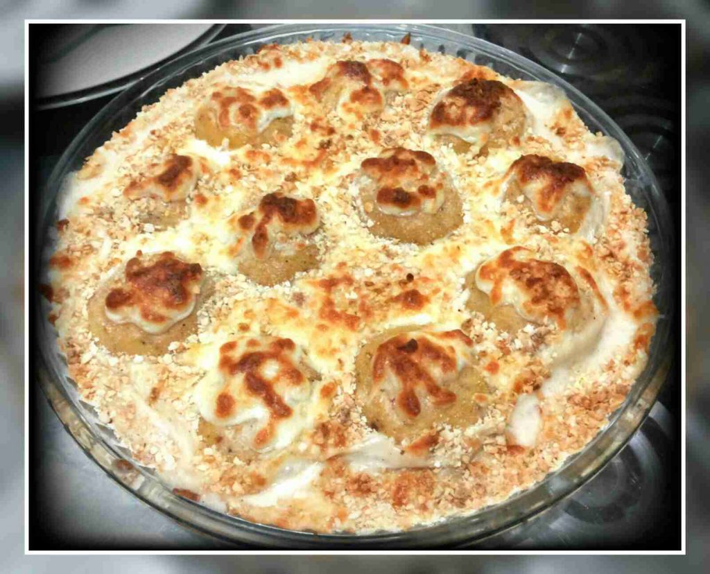 ممكن كرات بحيث نفرد خليط البطاطا على ايدنا وحشيناها وكورناها لتصير كرات ومنصفها بالجاط ومنحط البشاميل حواليها والقشقوان والبكصمات عالوش