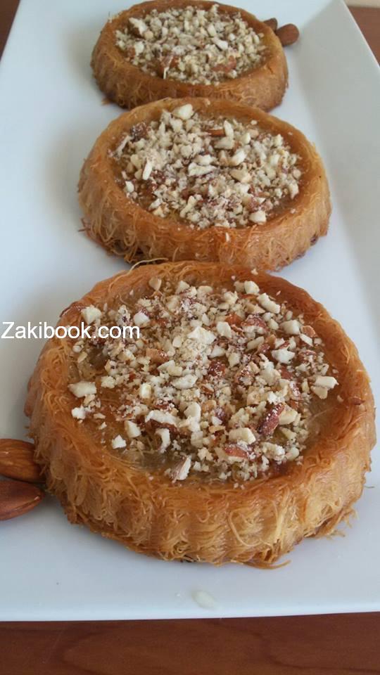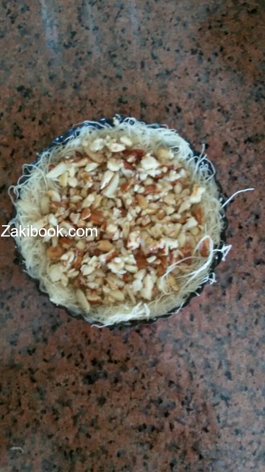 – الكنافة المحشية باللوز حمسي اللوز واهرشيه وضيفي شوية سكر وماء الزهر ورصي الكنافة في القالب تم ضيفي اللوز المخلط بالسكر والزهر تم رصي عليها طبقة من الكنافة المخلطة بالدهن.