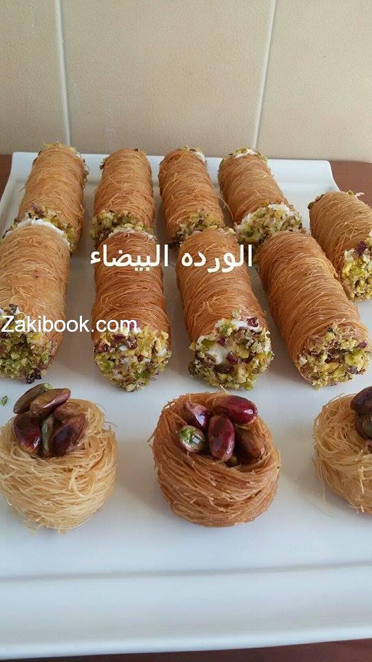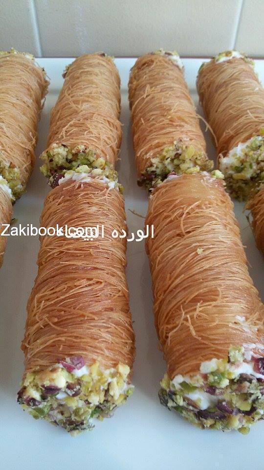 – كوب صغير كريم خفق ظرف كريم شانتي الصغير نص قالب جبنة فيلادلفيا ونخفقهم مع نص علبة قشطة ولابد يكون خليط متماسك بعد الخفق ونحشي بيها هدا النوع يلي مفتوح من الطرفين بعد مالفيت الكنافة علي قطعة المعدن الخاصة وقليتها أيضا ونفكها من المعدن ونعسلها ونتركها تنزل العسل الزائد ونحشي بالكريمة ونزين الطرفين بالفستق وضحت طريق اللف بالصور وبالصحة والعافية.
