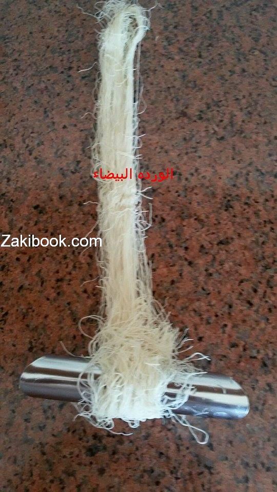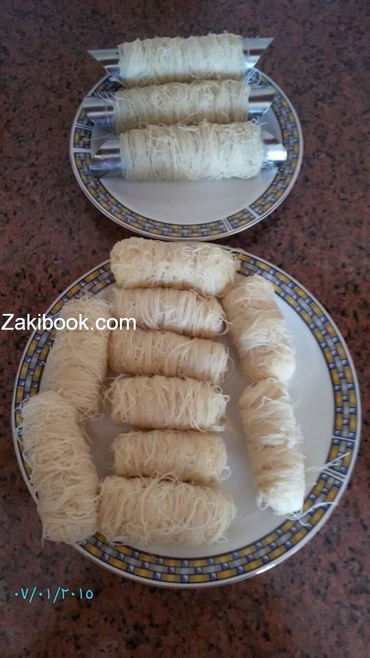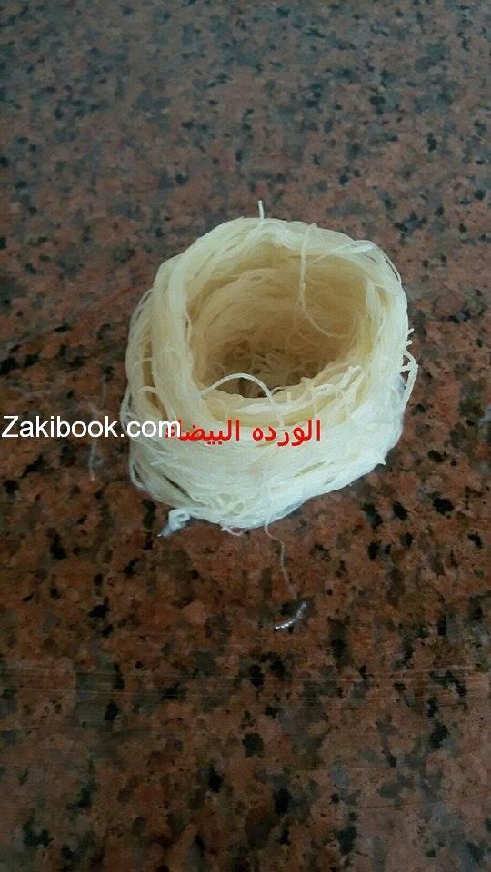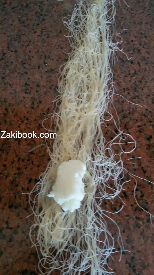– تاخدي الكنافة وتدهنيها بالزبدة الذايية اوالسمن اوخليط بينهم انا استخدمت الزبدة.