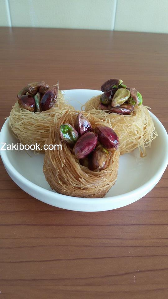 – تم تعسل وهي ساخنة تم توضع حبات الفستق بعد تحميسها وتوضع في عسل طبيعي