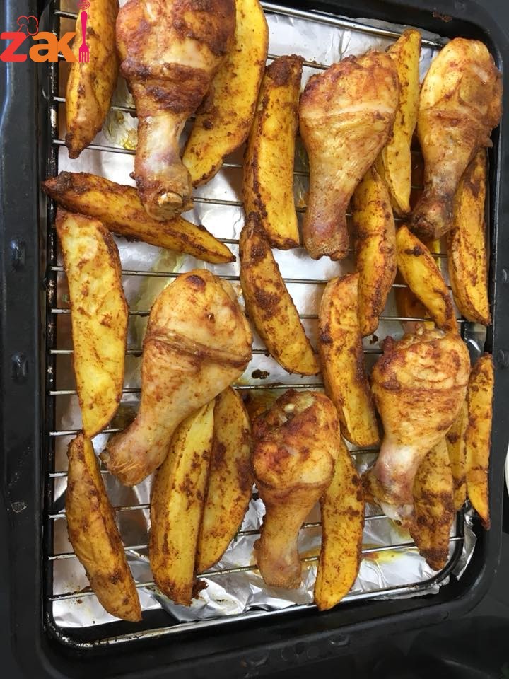 البطاطا قطعتن بقشرهم وغسلت قطع الدجاج بالطحين والملح والخل. وحضرت التتبيلة ملح كركم كزبرى بابريكا فلفل اسود وشوية حر بودرة خلطتن بزيت الزيتون وخلطت جزء منهم مع البطاطا والباقي مع قطع الدجاج وحطيتن على صنية شبك وشويتن حتى تحمروا في الفرن حوالي اربعين دقيقةوعملت توم الفروج بالبيت كتير طيب والف صحة.