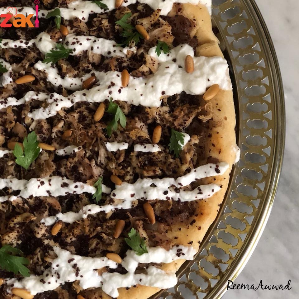 نفرد العجينة في صواني للفرن حسب السماكة المرغوبة ثم يوزع فوقها البصل جيدا ثم يوزع الدجاج ويرش فوقه السماق وندخل الفطيرة إلى الفرن المحمى مسبقا على درجة حرارة ٢٢٠ لمدة ربع ساعة أو حتى تتحمر قليلا أطراف العجينة.