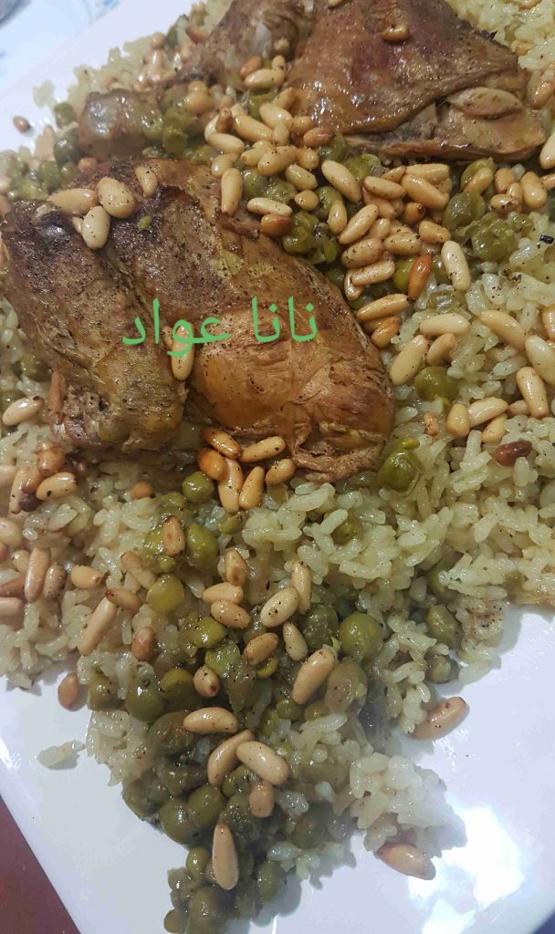 عندما ينضج الارز نضع قليل من البازيلاء على الارز ونحرك ونترك القسم الثاني للزينه