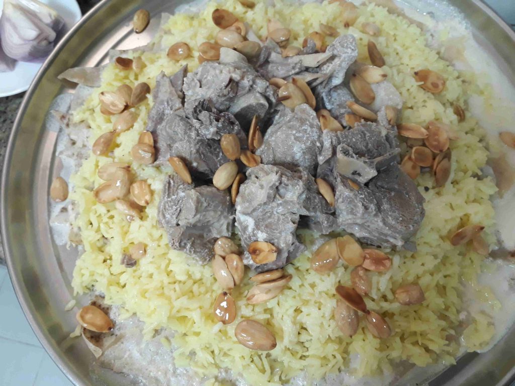 بخلط الجميد مع الشنينه مع معلقة اللبن بالمولينكس وبس تستوي اللحمه بدير الجميد شوي شوي عنار واطيه وبضل أحرك وبس تغلي بحط معلقه السمنه ويخليه يغلي عنار….