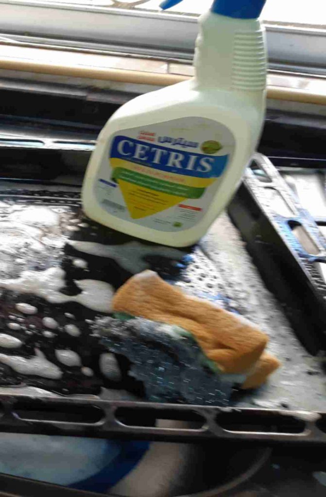 بشيل الشبك وصينية الفرن وبرشهم بالسيترس وبليفهم باسفنجة وسلكة وسائل جلي وبشطفهم وبتركهم ينشفوا وكذلك مناصب روس الغاز بنظفهم بنفس الطريقة .