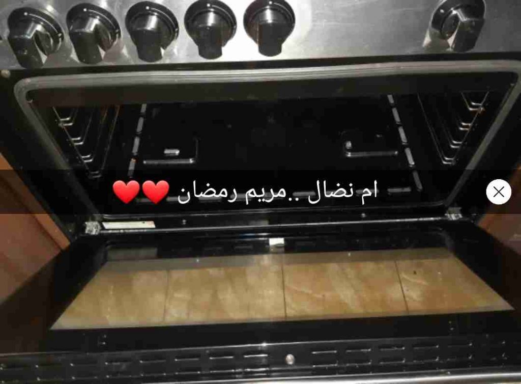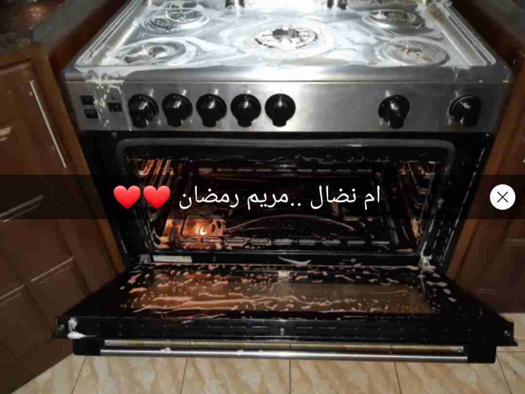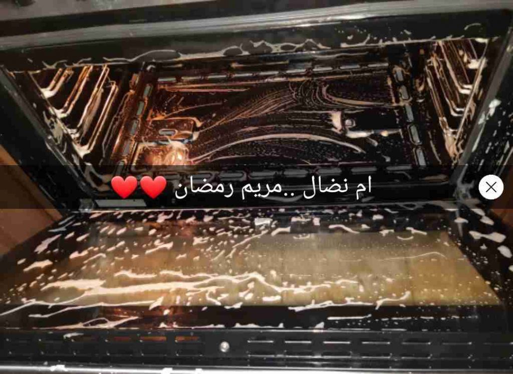 والفرن من جوا بليفه بليفة عليها خل وكربونات وبنظف الفرن منيح وبمسحه بفوطة مبلولة وبعدين ناشفه وبعدين بلمعه بملمع الزجاج وكذلك باب الفرن بنظفهبالسلكة وسائل الجلي وبشطفه بالمي وبس تتصفى المي بلمعه بالايزي
