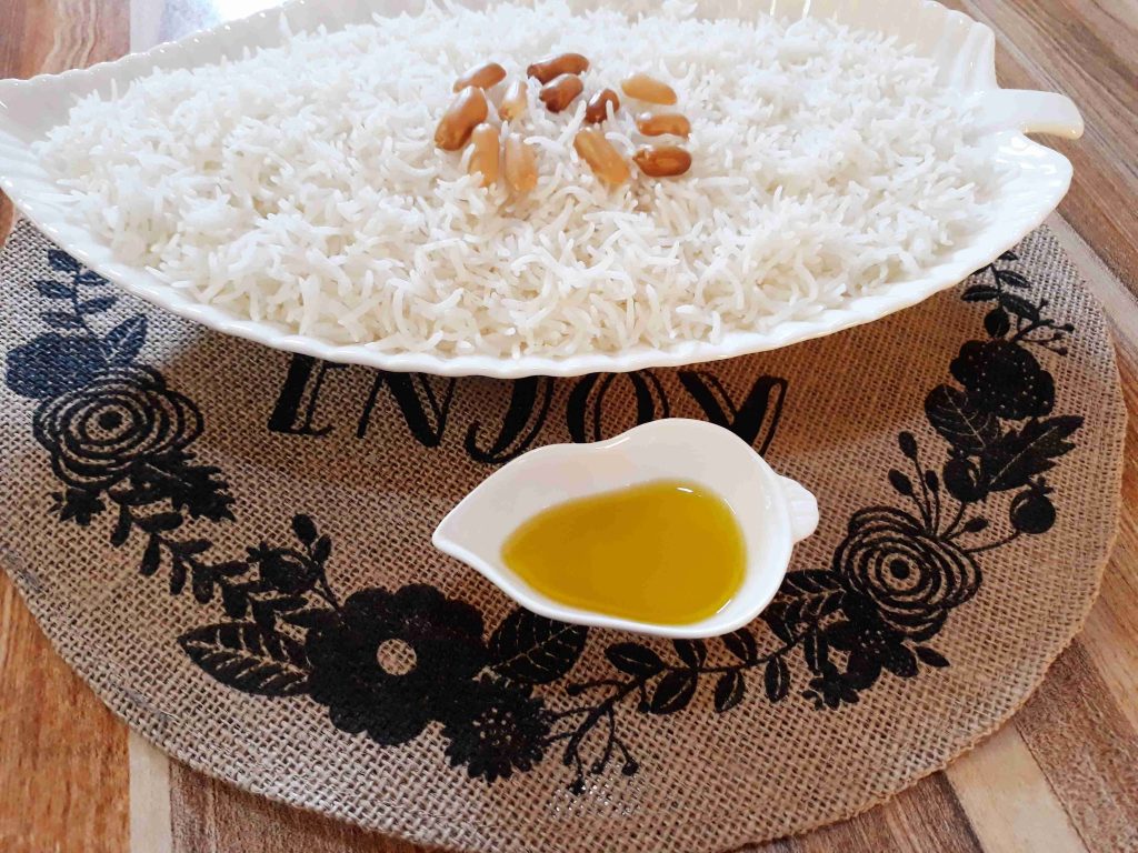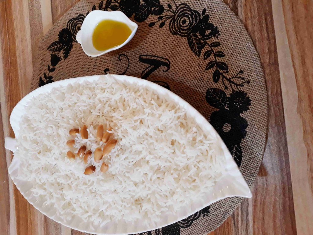 اول اشي بننقع الارز ساعه كامله بماء دافي وبعد هيك بنصفي الارز وبنغسلو منيح وبعد هيك بنحطو بطنجره مع خمس اكواب ماء حار ونص معلقه ملح وبنتركو يغلي عنار وسط لعشر دقايق بعد هيك بنصفي الارز من المي وبنرجعو على الطنجره وبنضيف زيت الزيتون وبنغطي الطنجره وبنتركو كمان عشر دقايق يتنشف من دون وضعه على النار وبعد هيك يقدم مع قليل من المكسرات المحمصه والف صحه وهنا
