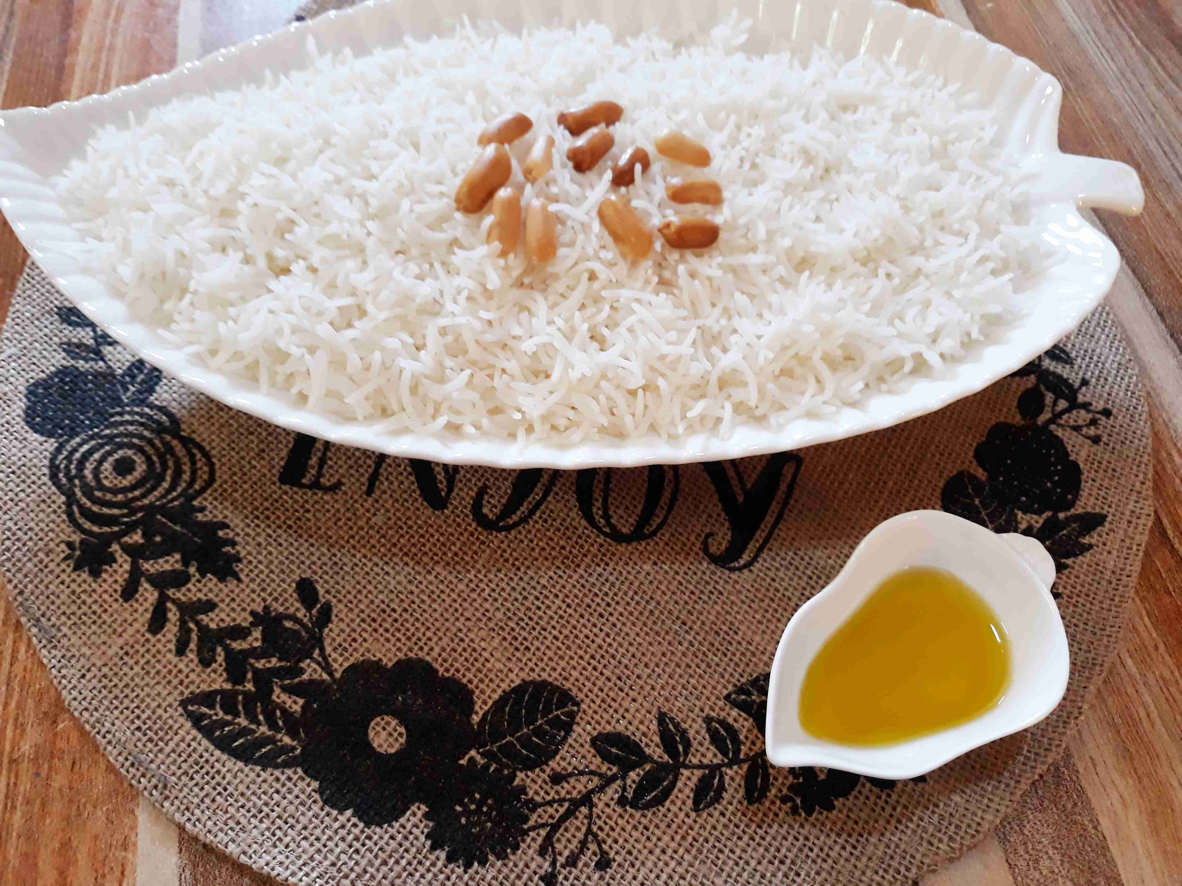 اول اشي بننقع الارز ساعه كامله بماء دافي وبعد هيك بنصفي الارز وبنغسلو منيح وبعد هيك بنحطو بطنجره مع خمس اكواب ماء حار ونص معلقه ملح وبنتركو يغلي عنار وسط لعشر دقايق بعد هيك بنصفي الارز من المي وبنرجعو على الطنجره وبنضيف زيت الزيتون وبنغطي الطنجره وبنتركو كمان عشر دقايق يتنشف من دون وضعه على النار وبعد هيك يقدم مع قليل من المكسرات المحمصه والف صحه وهنا