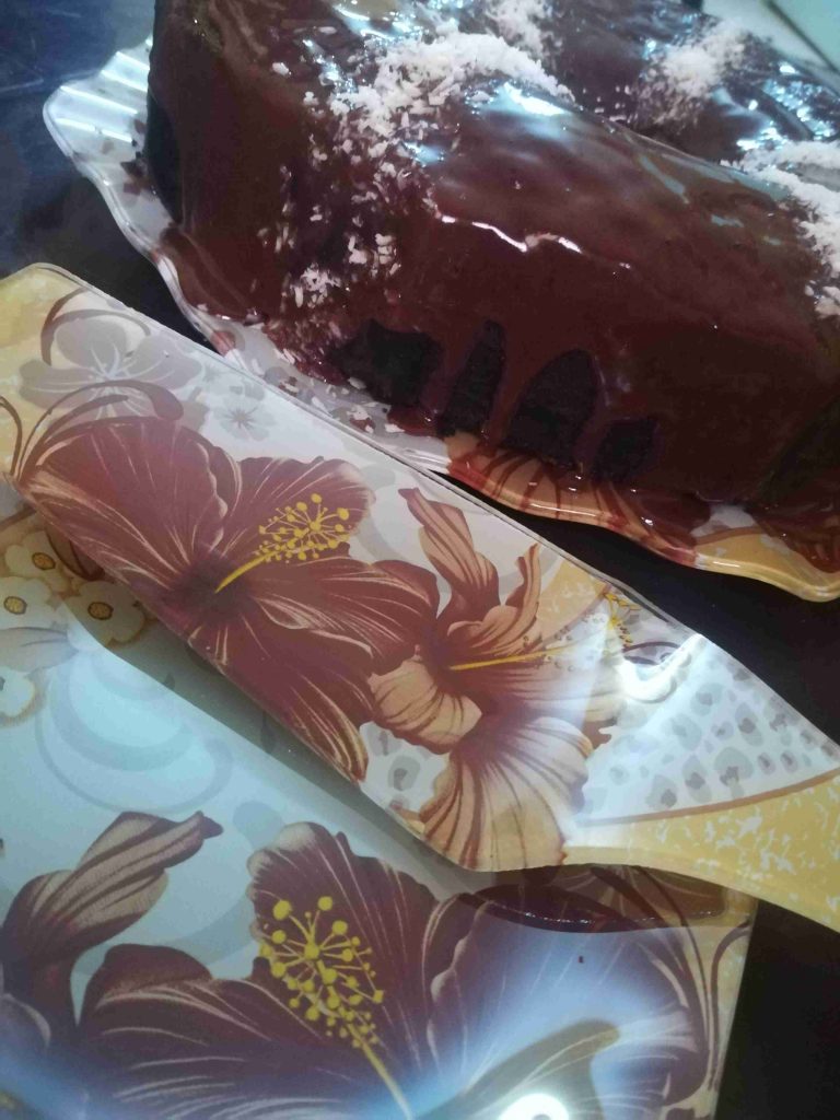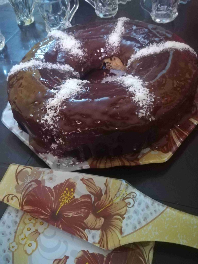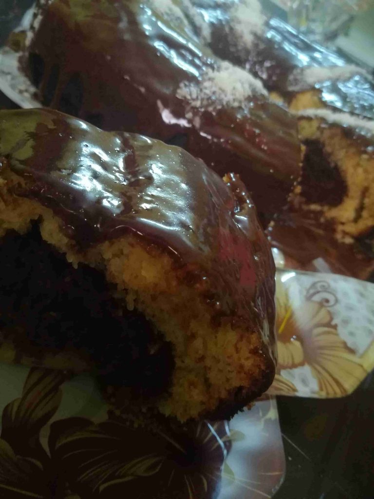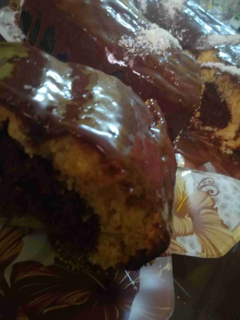 اول شي بنخلط البيض مع فانيلا ،بعدين زيت وسكر وبنضيف طحين تدريجيا،وباقي المواد بعد ما يجهز بندهن القالب بزيت ورشه طحين،بعد ما نضيف الخليط بنتدرك شوي منه وبنضيف الو كاكاو وبعدين بنضيفوو ع الخليط يلي بلقالب بدون ما نحركو لانو بس ينفخ الكيك بدخل خليط الكاكاو لداخل متل يلي بصوره،وانا زينتوو بنوتيلا وجوز الهند