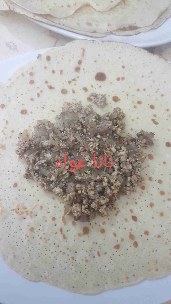 نمسك حبات الكريب كل وحده على حدا ونقوم بوضع كميه من الحشو بوسط الكريب ونغلقها مربعات وهكذا الى ان تنتهي الحشوه وحبات الكريب