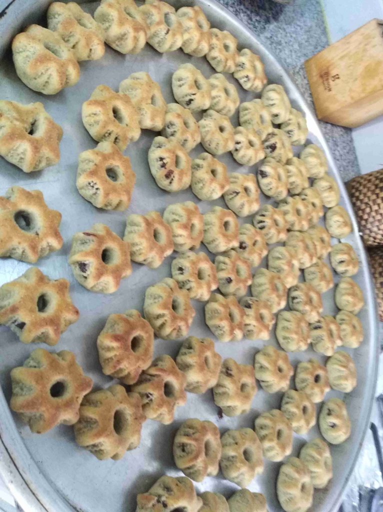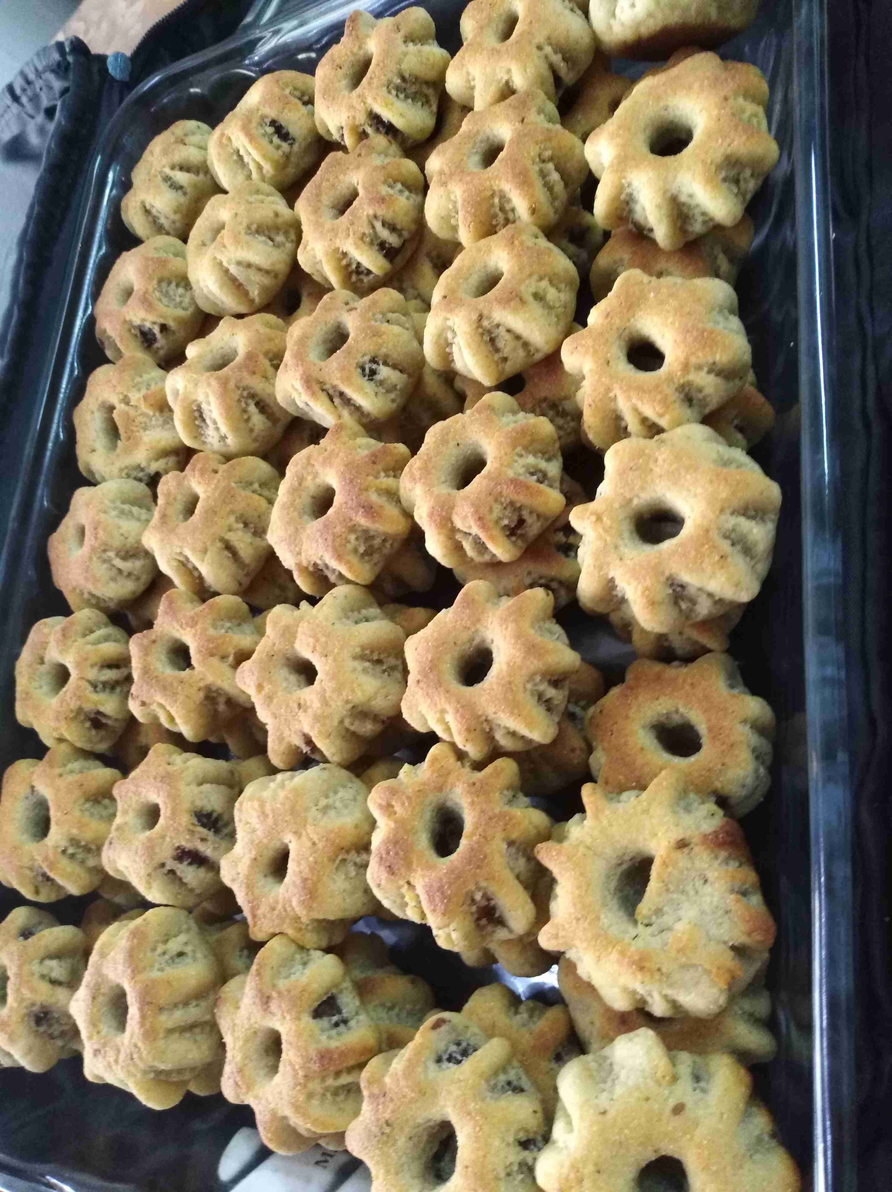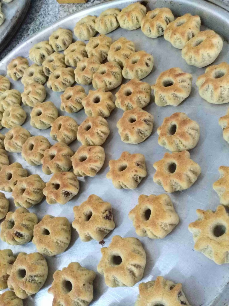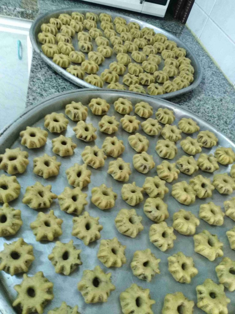بتبسي السميد والطحين والسمنه والزبده واليانسون والشومو ودقه الكعك باطراف الاصابع وبنتركهم ليله كامله وتاني يوم بنضيف باقي المكونات وبنعجنهم وبنبلش نحشي انا حشيت بتمر مع معلقتين زبده وملعقه يانسون ومعلقه شومر