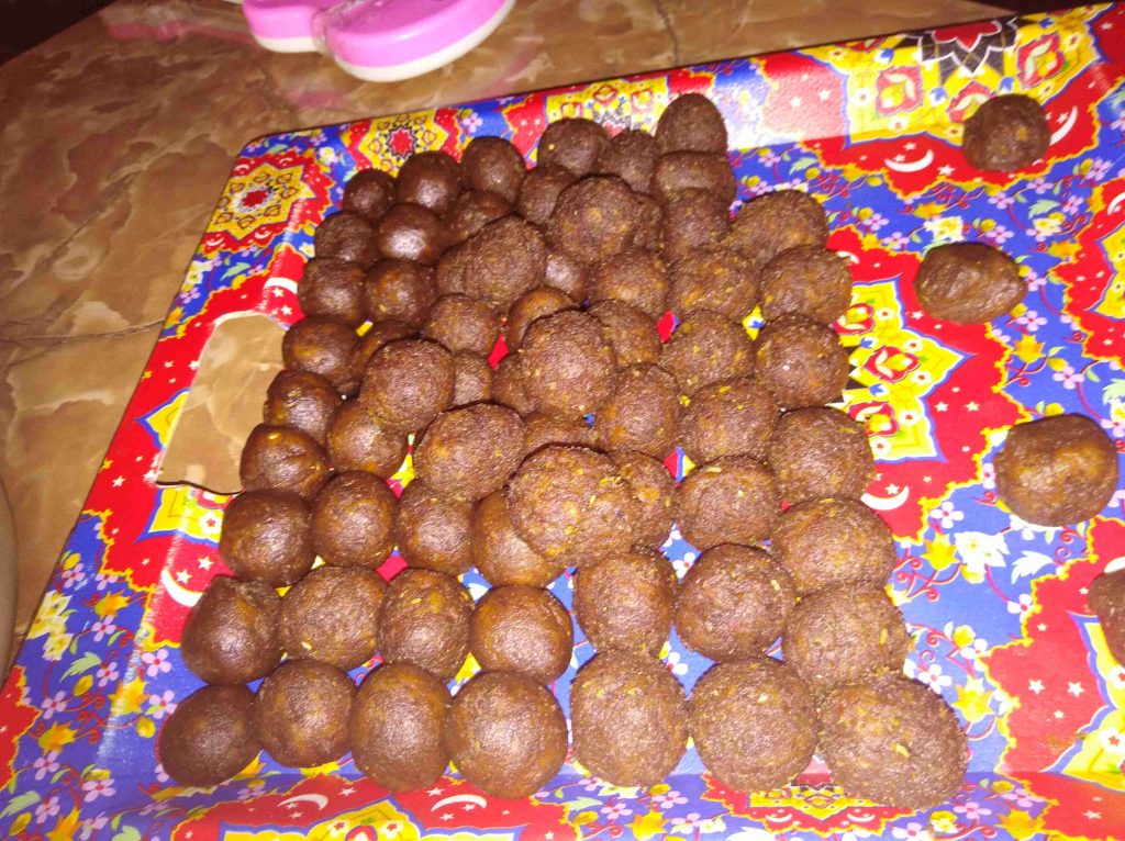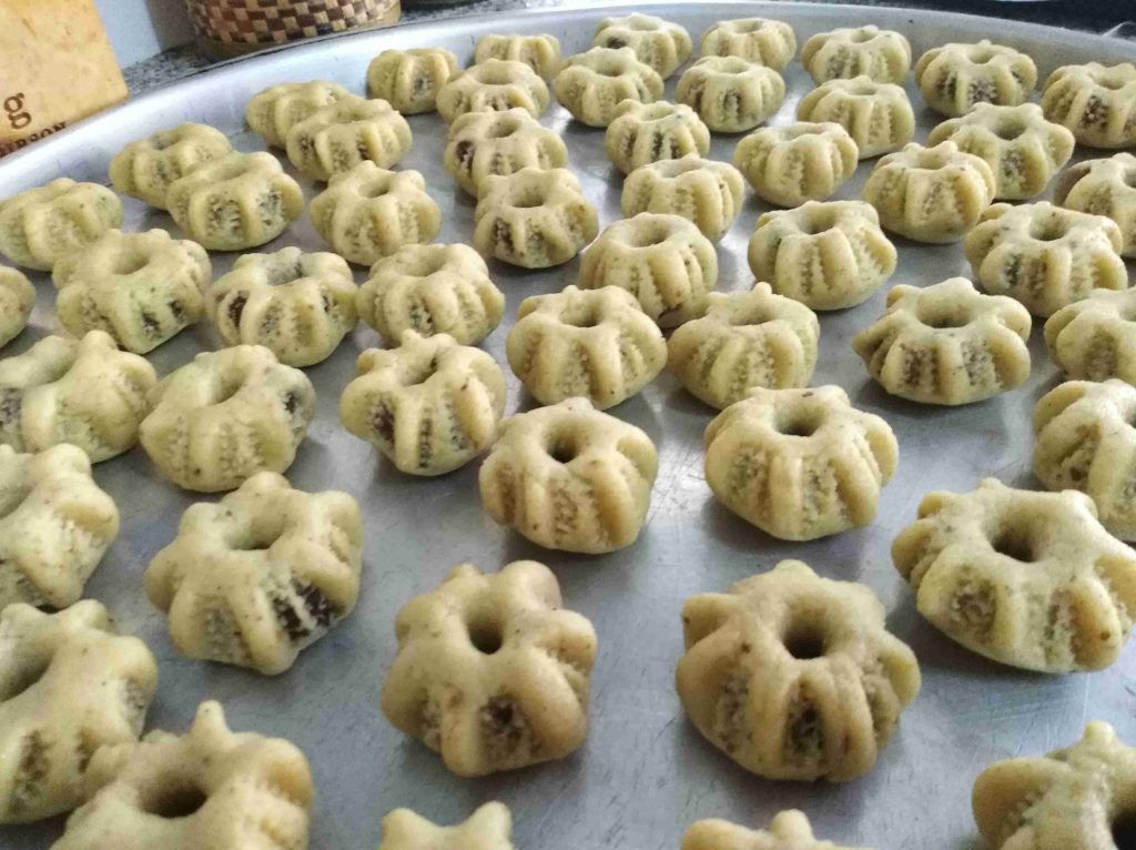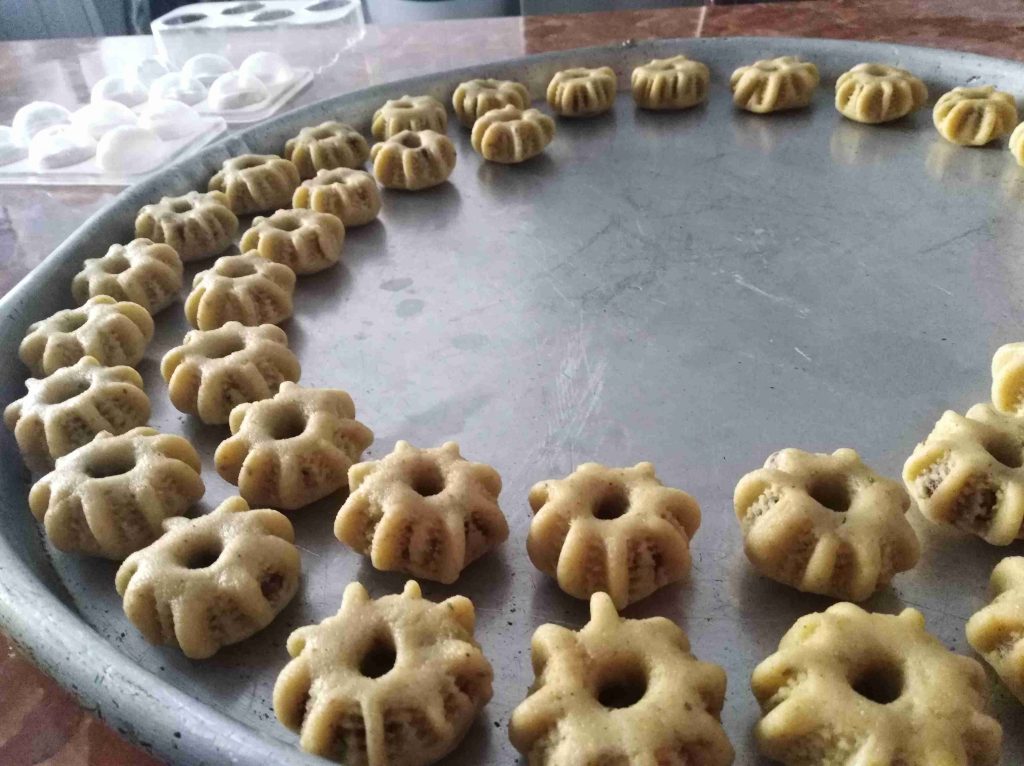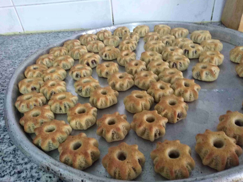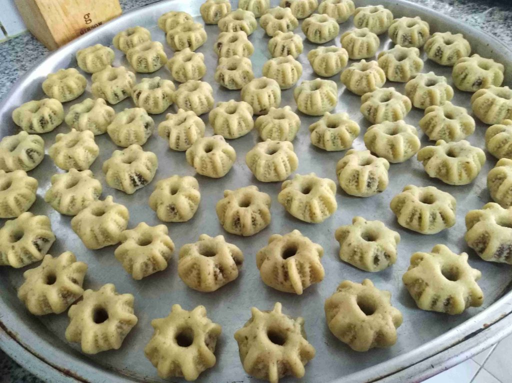بتبسي السميد والطحين والسمنه والزبده واليانسون والشومو ودقه الكعك باطراف الاصابع وبنتركهم ليله كامله وتاني يوم بنضيف باقي المكونات وبنعجنهم وبنبلش نحشي انا حشيت بتمر مع معلقتين زبده وملعقه يانسون ومعلقه شومر
