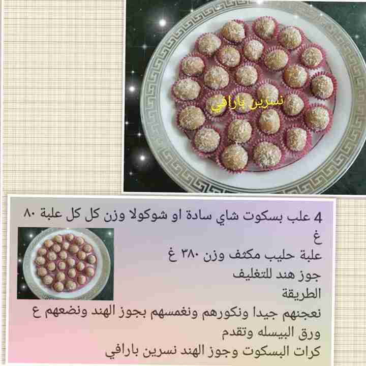 نضع البسكوت والحليب ونعجنهم مع بعض ونكورهم ونغمسهم بجوز الهند ونضعهم ع ورق البيسله وتقدم والف صحة