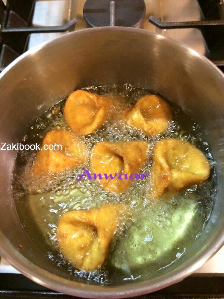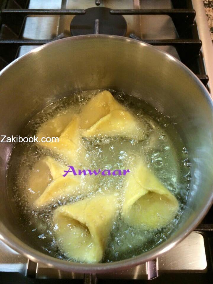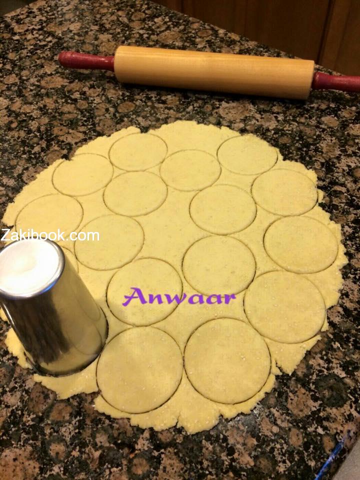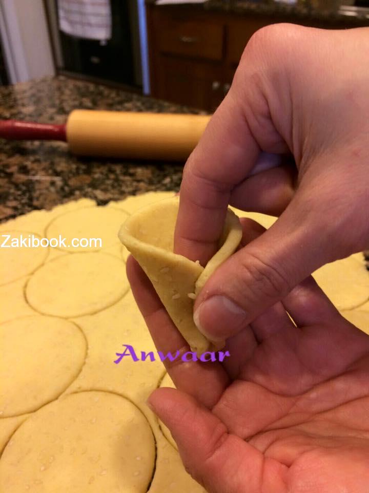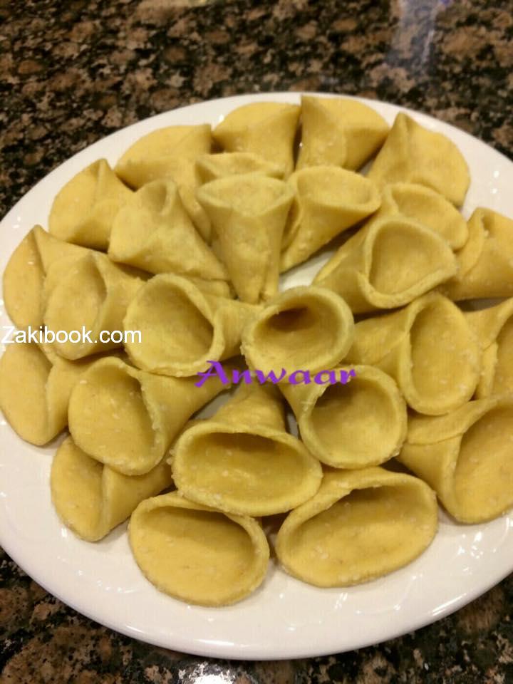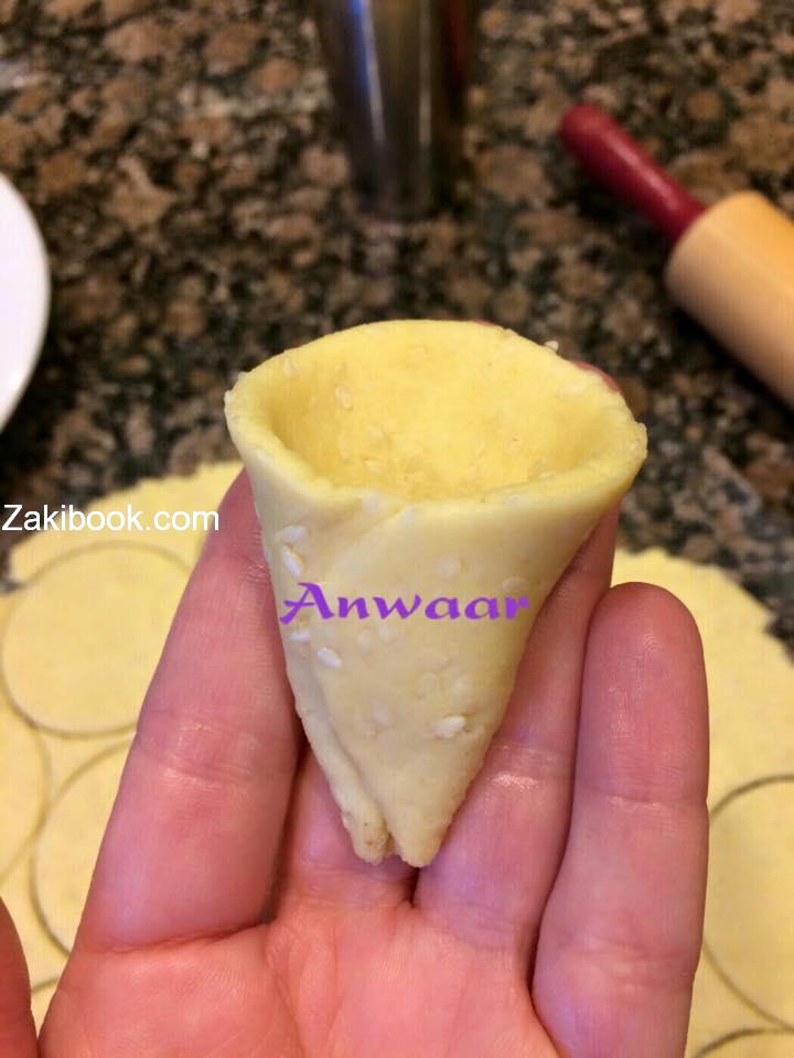 – ومن ثم تستعمل بفتح العجينة بسمك نصف سم وتقطيعها على شكل دوائر ومن ثم ثني كل دائرة بالأيد لتشكيلها على شكل قمع والضغط عليها باطراف الأصابع لتلتصق وتتماسك الأطراف ببعضها.