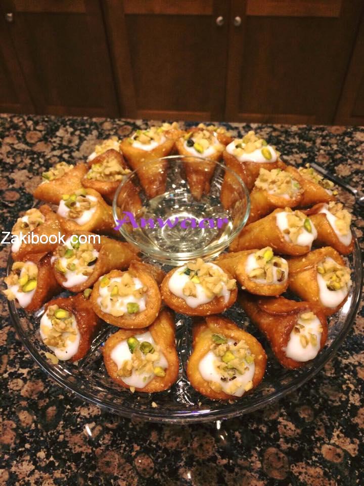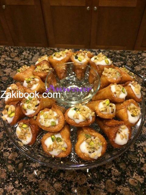 اقماع السميد لمحبين الاطباق التي تحتوي على الشيره اي القطر وبحشوه القشطه اللذيذه وطريقه سهله ومبسطه ومضمونه للمبدعتنا وصديقتنا انوار منصور.