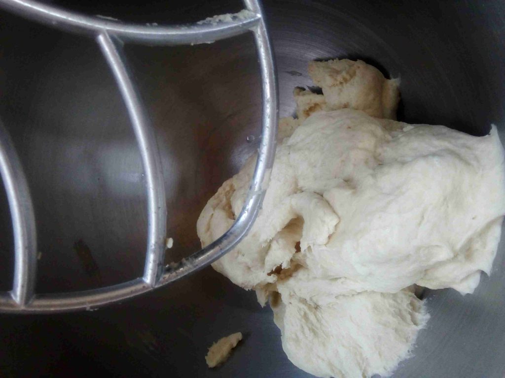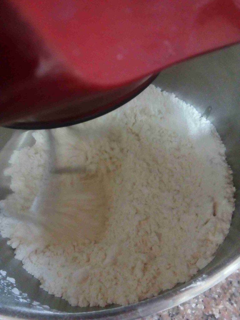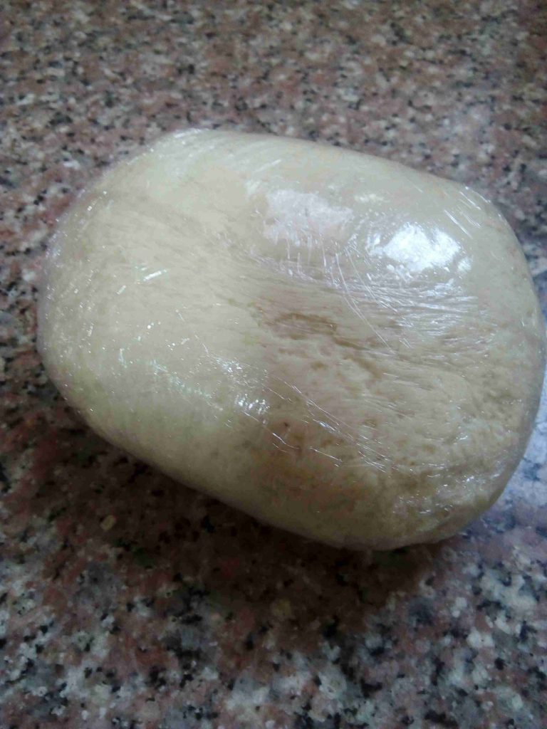 # العجينة: بنخلط الزيت مع الطحين والملح وبنضيف الماء شوي شوي لحتى تلم العجينة معك فقط مابدنا عجينة لينة.. المفروض تكون جامدة.. ممكن تاخد تلات ارباع كوب مي.