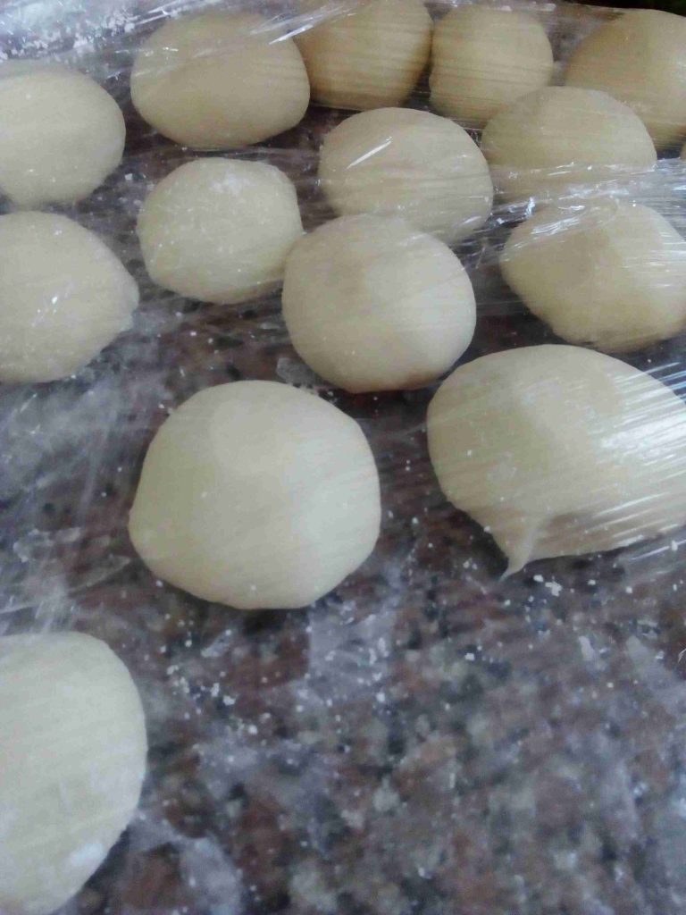 # بنقطعها كرات صغيرة بحجم اكبر من حبة الجوز بشوي… وبنصير نشتغل بأول قطعه كورناها بالترتيب لحتى تفرد معنا منيح.