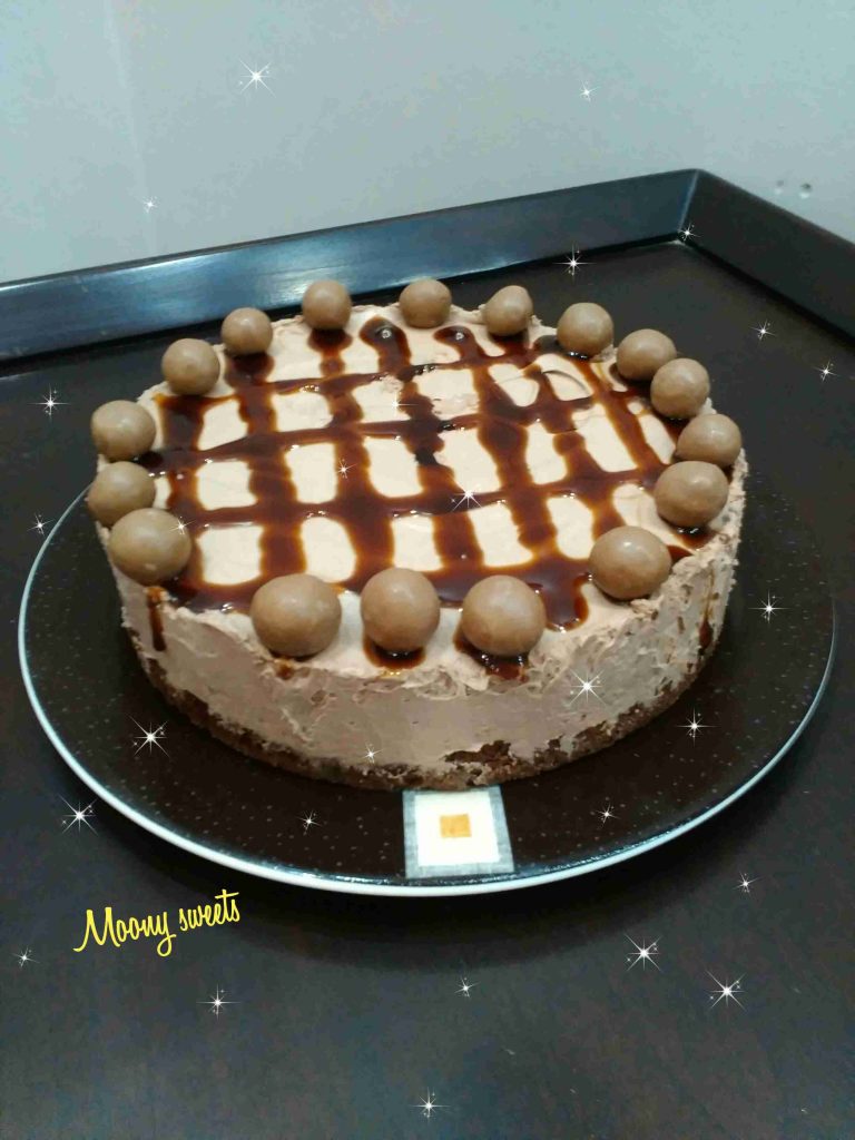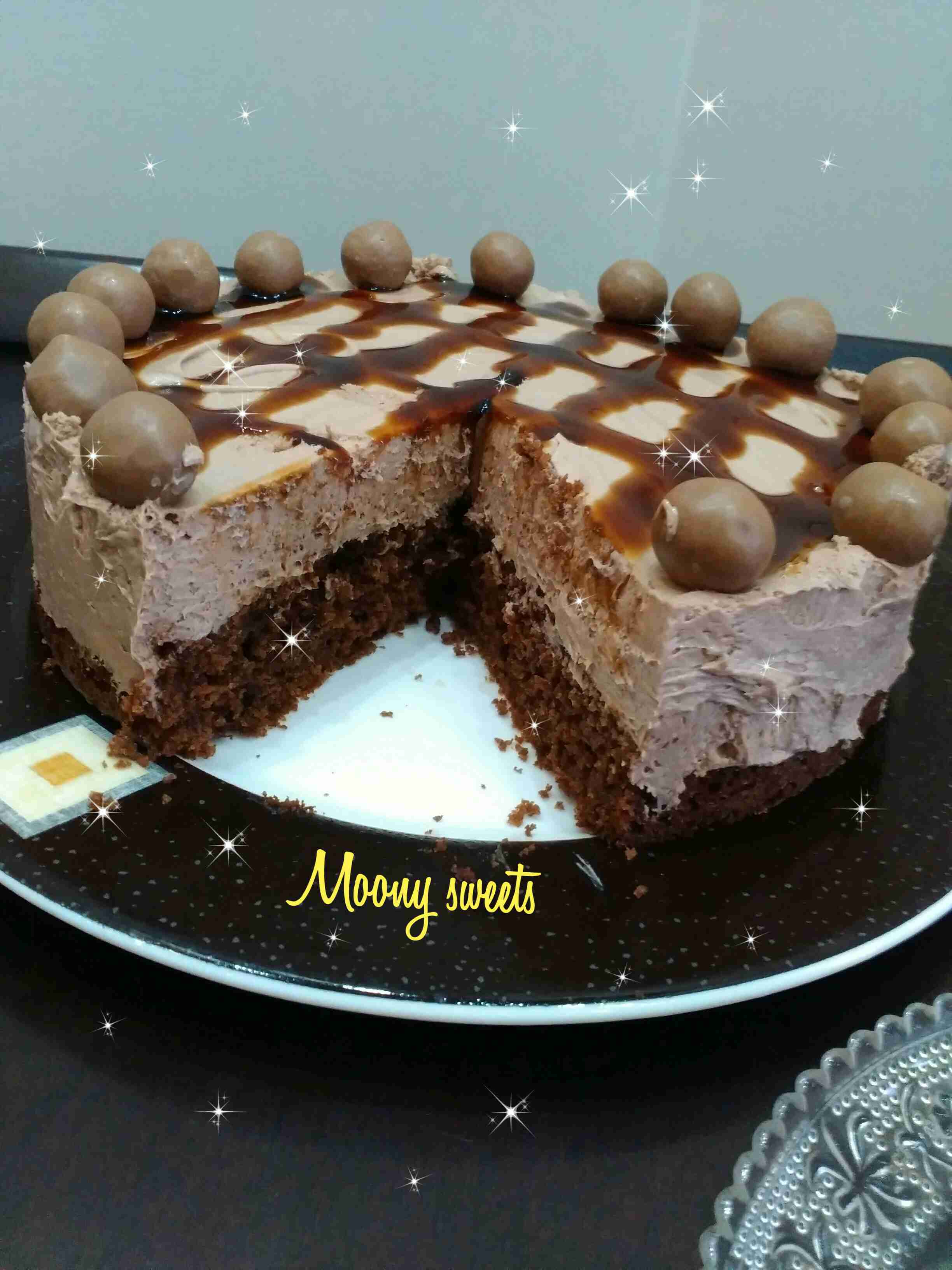 عملت كيكة شوكولا بقالب تشيز كيك اصغر حجم بعدين لما استوت وبردت عملت اربع مغلفات كريما دريم ويب فانيلا بعدين ضفت عليهم نص كوب شوكليت شيبس طبعا كنت مسيحتهم ع حمام مائي وبخلطهم منيح وبعدين هدا الخليط بحطه فوق الكيك وخليت الكيكة بالتلاجة ليلة كاملة بعدين زينتها