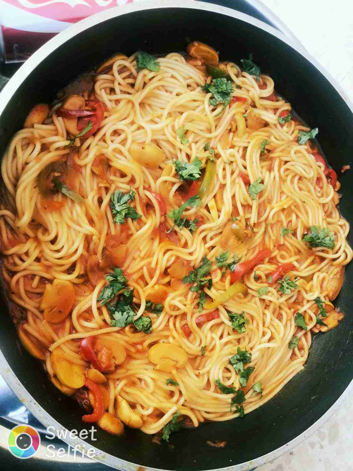 بنحوس البصله بشوية زيت وفلفل والفطر والبندوره والبهارات والملح والصلصل وشوية مي وماجي طبعا بنكون سالقين المعكرونه وبننضيفها عالصلصله