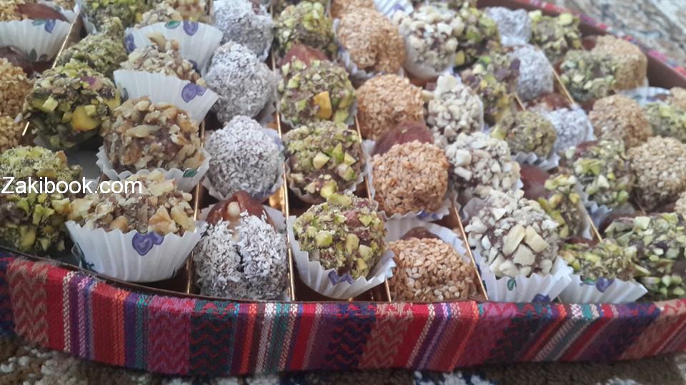 نشيل النواة من التمر ونضع قطعة كاجو كبيرة اذا ممكن ثم نغطس قطعة التمر بشكلاطة سوداء او بيضاء سائلة للنصف ثم نضعها مباشرة بالفستق الحلبي المجروش او السمسم المحمص او اللوز المجروش او جوز الهند ونضعها بالثلاجة نصف ساعة لكي تجمد ثم نضعها بورق الكب كيك الصغير ونرصها بعلبة شكلاطة جميلة وتقدم للعائلة او الضيوف وبالعافييييييية ام مناف البيطار