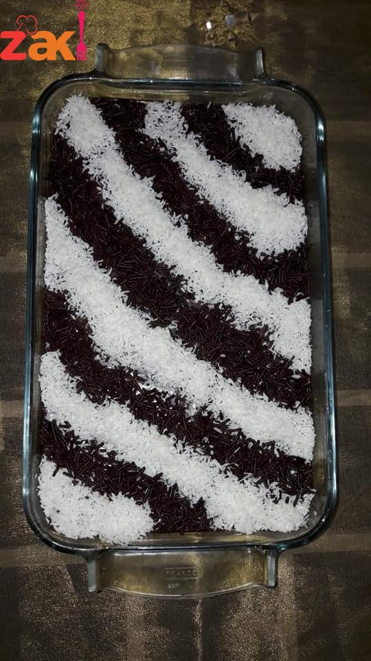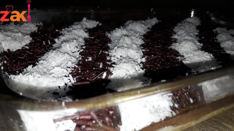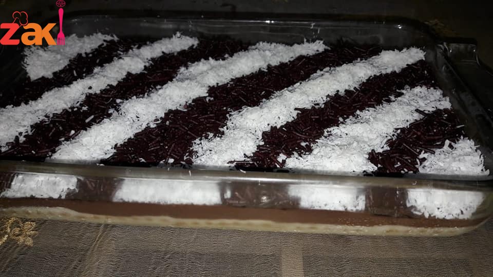 نصف البسكوت في طبق بايركس ثم نسقيه بالنسكافيه ونعمل الصلصة البيضاء نضع في طنجرة الدقيق والسكر والفانيلا والحليب المذوب بالماء ونحركهم على البارد ثم نضعهم على النار مع التحريك المستمر نضع الزبدة للخليط ونستمر بالتحريك حتى يغلي ويتكاثف المزيج ثم نطفئ النار من عليهم ونصب نصف الكمية فوق طبقة البسكوت كطبقة أولى ثم نضيف للقسم الثاني من الخليط ٣ ملاعق كاكاو ونحركهم جيدا ونضعهم في خلاط كهربائي ونشغل الخللاط حتى ينعم المزيج ويصبح مثل مزيج الكريما ويذهب التكتلات يلي بالكاكاو نعمل طبقة أخرى من البسكوت مشربة بالنسكافيه ثم نصب خليط الشكولاته يلي عملتاه فوق طبقة البسكوت الثانية ونهز الطبق جيدا حتى يتوزع على كل انحاء الطبق ثم نضعه في الثلاجة مدة ٣ ساعات على الأقل حتى يجمد ويبرد الخليط ثم نزين الطبق بصفوف من جوز الهند وفارمسيلي الشكولاته ونقدمها باردة ( وصحتين وعافية)