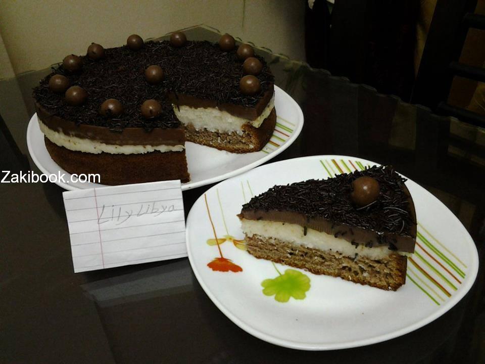 كيكة من ثلاث طبقات الأولى كيك, والثانية خليط جوز الهند المحلى, والثالثة شكولاتة, صديقة زاكي المميزة Lily Libya تخبرنا على طريقة تحضيرها بالتفصيل.