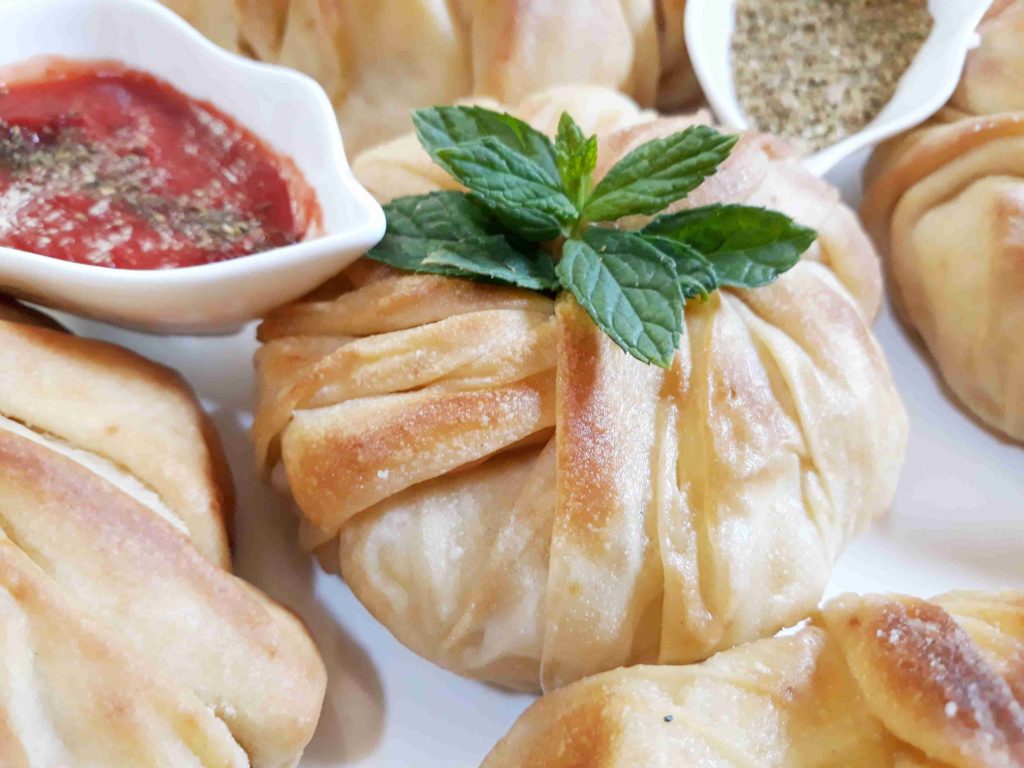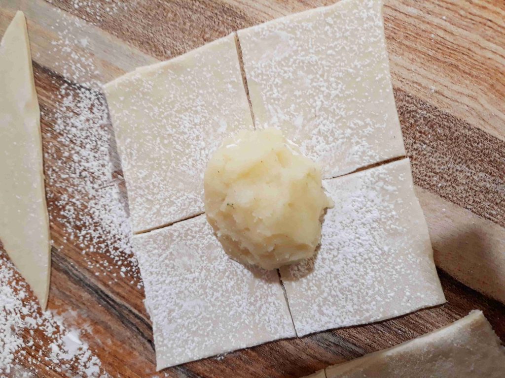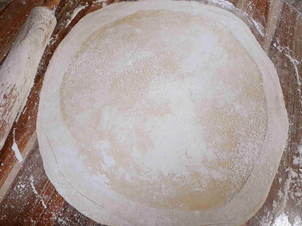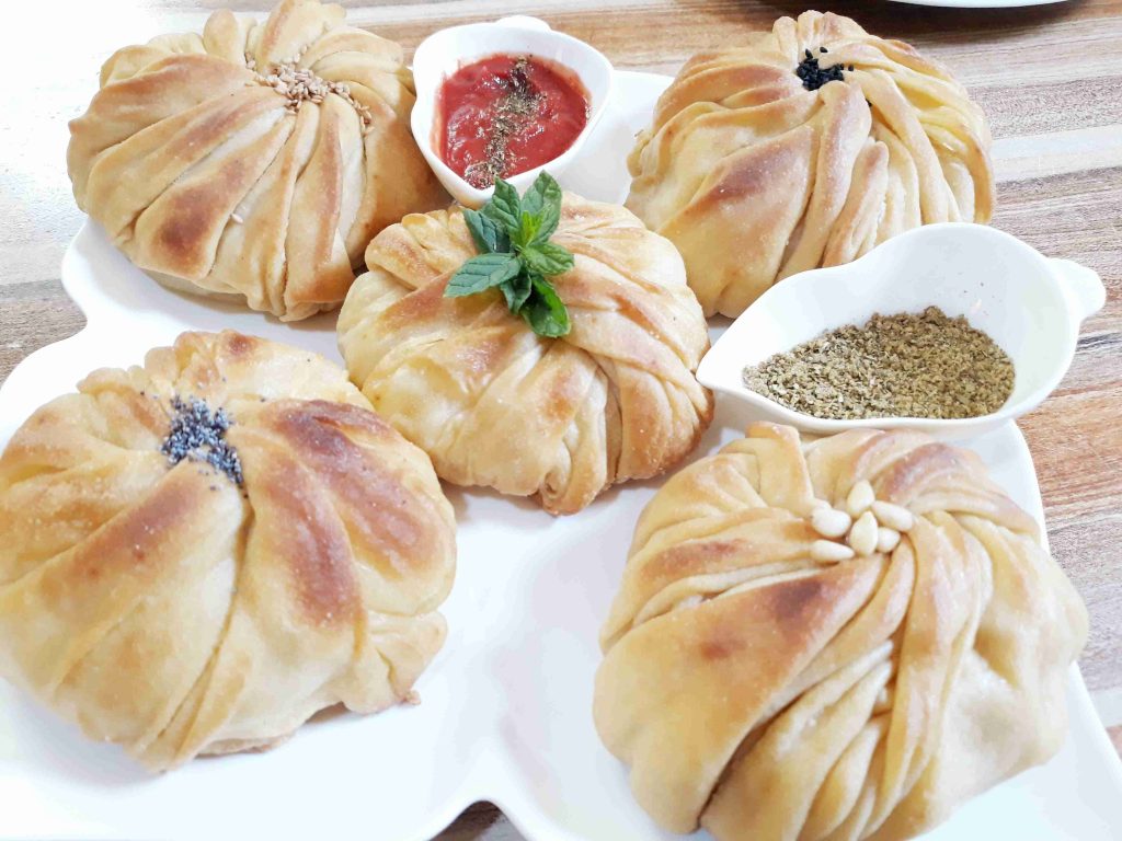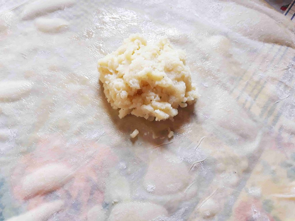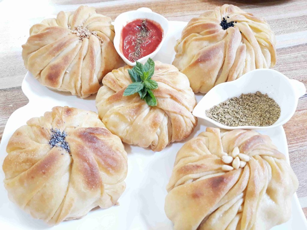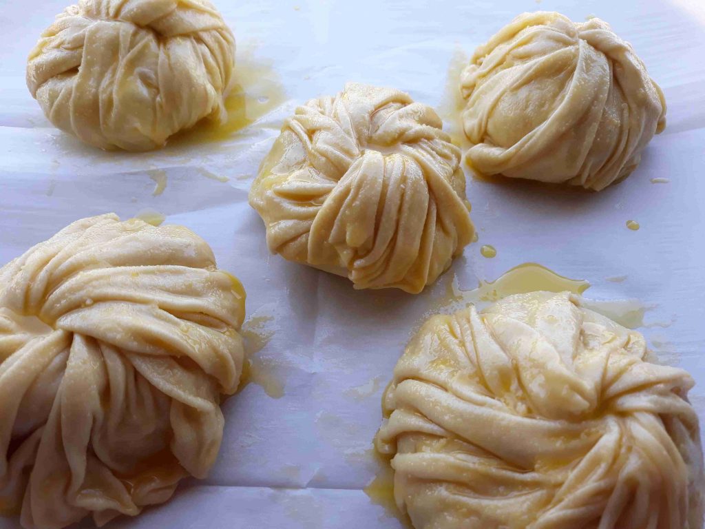 بنخلط المكونات الجافه وبنضيف الزيت وبنبسو معهم شوي وبنبلش نضيف الحليب الدافي وبنعجنهم منيح لما تتماسك العجينه وتسير ناعمه وطريه بنتركها تخمر نص ساعه وبعد هيك بنقطعها 12 كره صغيره او حسب الطلب بنرقها بالبدايه ارغفه صغيره وبنضيف بينهم كميه منيحه من النشا وبعد ميسيرو ست ارغفه بنبلش نرقهم رقاقات رقيقه جداا وبنبلش بأول رقاقه بندهنها زبده وبنقلبها على الجهه الثانيه وبنحط فيها الحشوه وبنسكرها على شكل كيس مع لفه وحده وبنطوي العجينه الي فوق لتحت على شكل كسرات وبنبلش نطوي اطراف العجينه على شكل كسرات وبنقص القسم المتبقي عكل حال انا موضحه الطريقه بالصور وبنصفها على صينيه الفرن وبندهنها كمان مره بالزبده وبنخبزها بالفرن على درجه 180 لمده عشرين دقيقه او اقل حسب الفرن ولما يسير لونهم ذهبي وبنقدمها ساخنه والف صحه وهناا يا رب