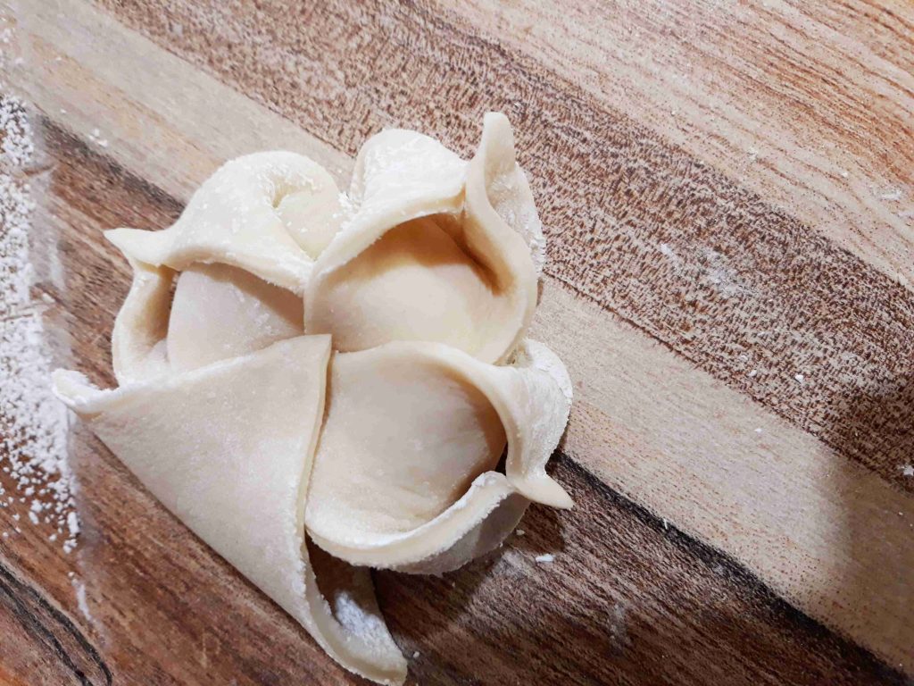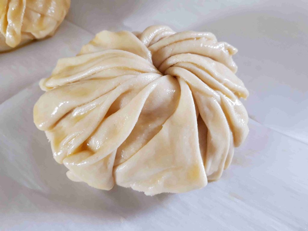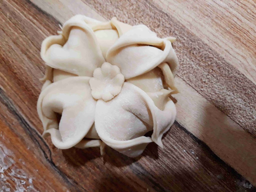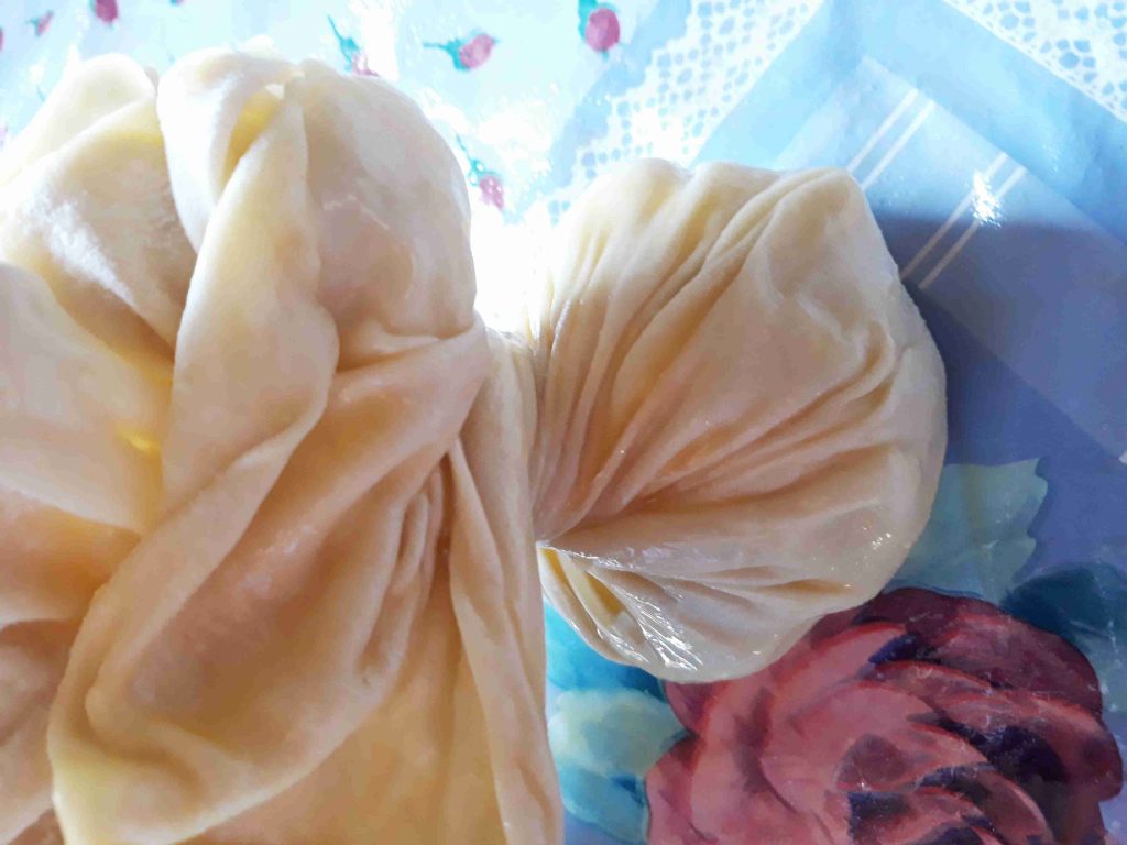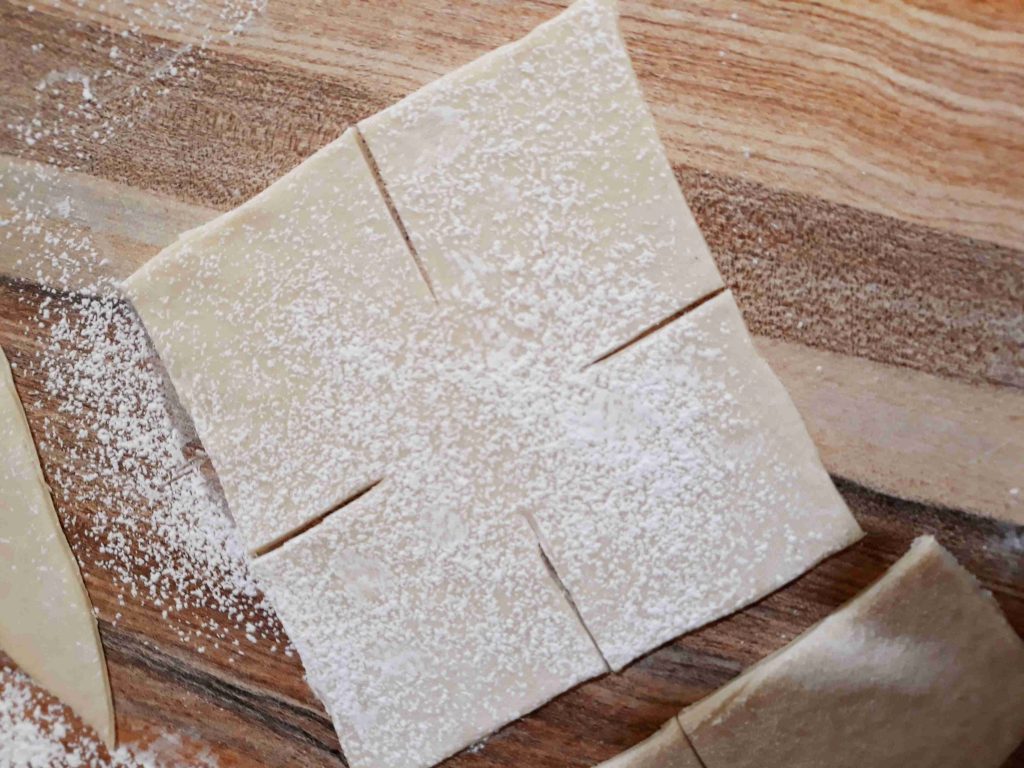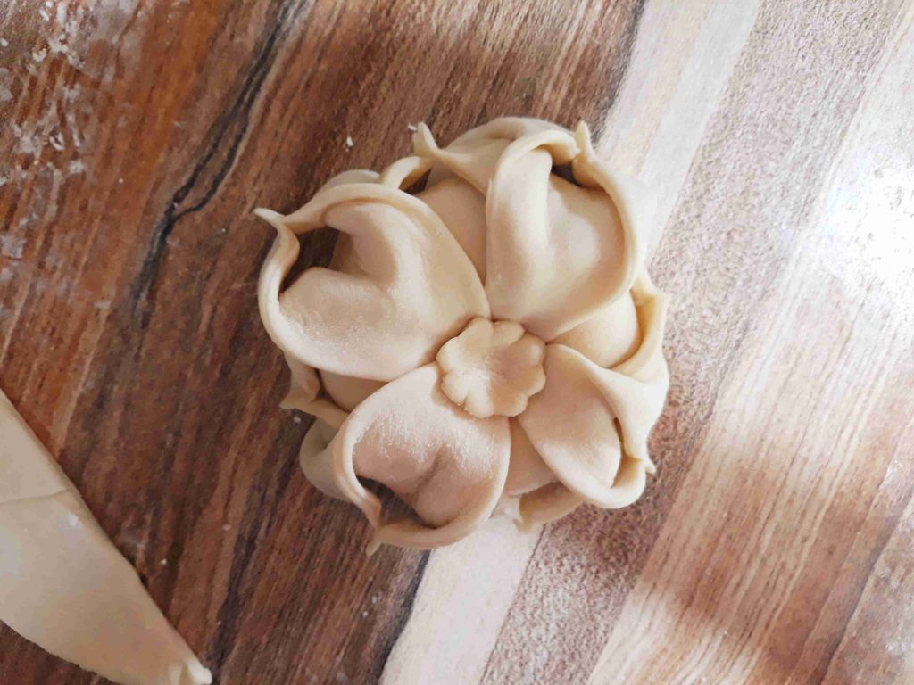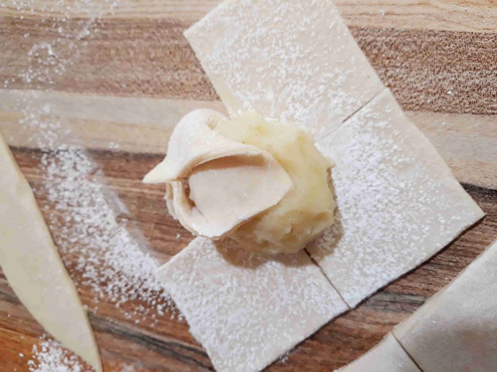 بنخلط المكونات الجافه وبنضيف الزيت وبنبسو معهم شوي وبنبلش نضيف الحليب الدافي وبنعجنهم منيح لما تتماسك العجينه وتسير ناعمه وطريه بنتركها تخمر نص ساعه وبعد هيك بنقطعها 12 كره صغيره او حسب الطلب بنرقها بالبدايه ارغفه صغيره وبنضيف بينهم كميه منيحه من النشا وبعد ميسيرو ست ارغفه بنبلش نرقهم رقاقات رقيقه جداا وبنبلش بأول رقاقه بندهنها زبده وبنقلبها على الجهه الثانيه وبنحط فيها الحشوه وبنسكرها على شكل كيس مع لفه وحده وبنطوي العجينه الي فوق لتحت على شكل كسرات وبنبلش نطوي اطراف العجينه على شكل كسرات وبنقص القسم المتبقي عكل حال انا موضحه الطريقه بالصور وبنصفها على صينيه الفرن وبندهنها كمان مره بالزبده وبنخبزها بالفرن على درجه 180 لمده عشرين دقيقه او اقل حسب الفرن ولما يسير لونهم ذهبي وبنقدمها ساخنه والف صحه وهناا يا رب