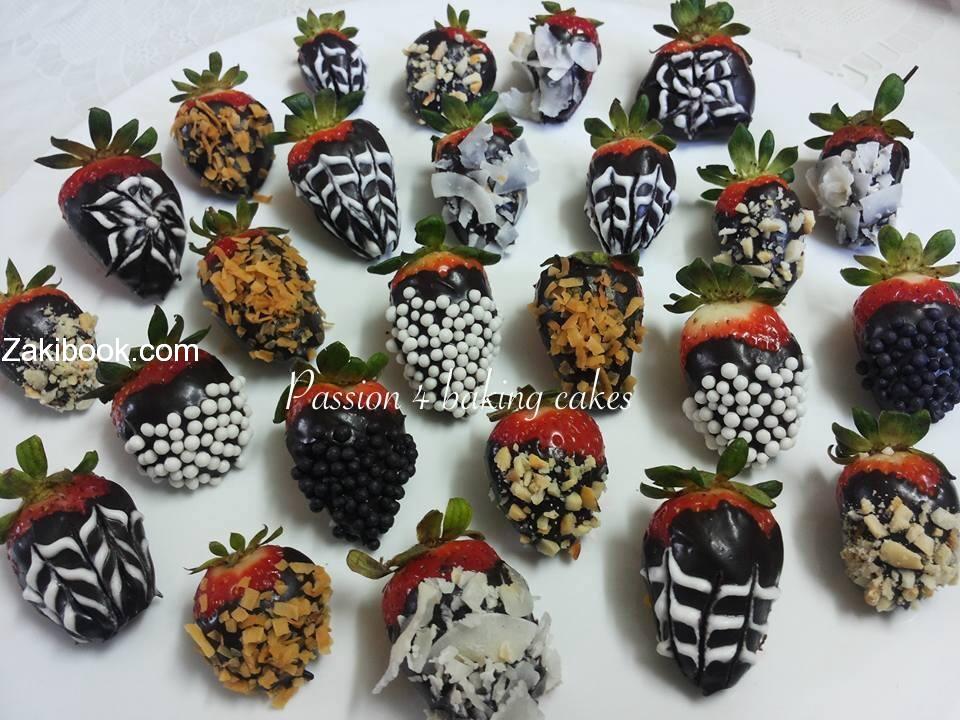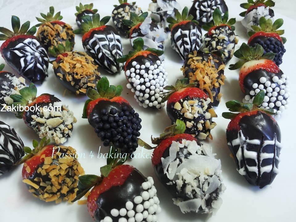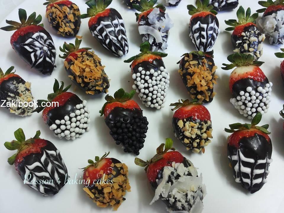–  بعد ذلك غلفت الفراولة بالشكولاتة وزينتها بجوز هند ابيض وجوز هند محمص وبراغيت ستات ابيض واسود وشي استخدمت كريمة خفقتها ورسمت علشكولاتة فيها.