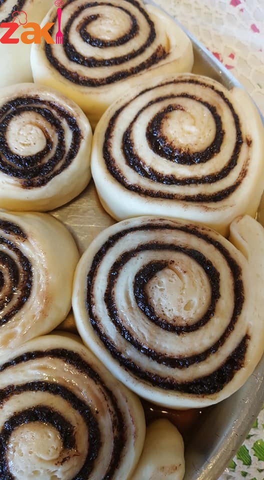 ويغطى بورق النايلون وبتركهن ساعتين ليتضاعف الخحم بخبز السنامون بفرن حرارته 200 ليتحمر اسفل العجين وبعدها بحمر الوجه لثواني