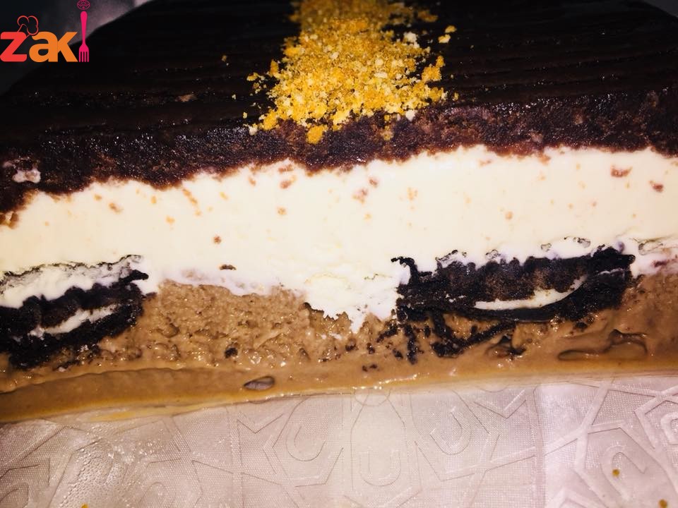 عملت كيك شكولاتة وفتفت الكيك وعجنته بملعقتين قشطة واشوي موس شكولاتة وبطنت القالب بنايلون تغليف وضعط الكيك على القالب والحواف بعدين عملت خليط الايسكريم وقسمتة نص ابيض ونصف شكولاتة واول صبيت الابيض ولمن جمد بالفريزر رصيت عليه بسكوت اوريو مغمس بحليب وبعدين صبيت خليط ايسكريم الشكولاتة وغلفتوه وعلى الفريزر لمن جمد قلبتوه وزينته بموس الشكولاتة والبسكوت المطحون
