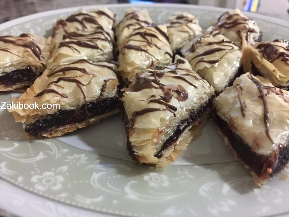 – ثم نغطيه كمان ب 12 رقاقه وبين كل رقاقه ندهنه بالزبدة والزيت. .عند الانتهاء نضعه في الثلاجة. .تبرد قليلاً حتى نقدر على تقطيعها حسب ما نحب وندخلها الفرن ع 250. ..لحد ما تشقر ونخرجها نسقيها بالقطر البارد. ..ونزينها بالنوتيلا.