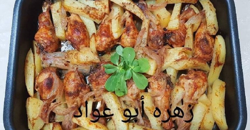 حطي الدجاج بالصينية وحطي البطاطا والبصل وكوب ماء ورشه بهارات غطيها بورق المينوم ودخليها الفرن لحد ما تستوي ارفعي الورق وحمريها من فوق