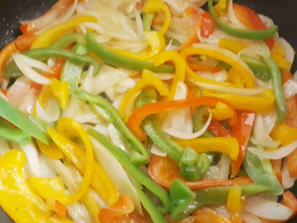 بهالوقت بنبلش بتحضير الدجاج بنحوس البصل المقطع جوانح مع حبات الفلفل الملون المقطع بالطول والفلفل الحار المفروم والثوم بالزيت لما يذبلو
