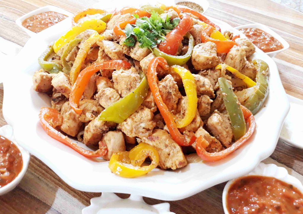 بنشيلهم عجنب وبنضيف بنفس الزيت قطع الدجاج الي نقعناه بالبهارات وبنحركهم بين كل فتره وفتره لما يتنشفو منيح ويستوي الدجاج بنطفي الغاز وبنظيف عليهم الفلفل الي حسناه وبنقلبهن مع بعض وتقدم مع خبز التورتيلا او خبز الصاج والف صحه وهناا يا رب تعجبكم لا تنسو تضيفوها للمفضله