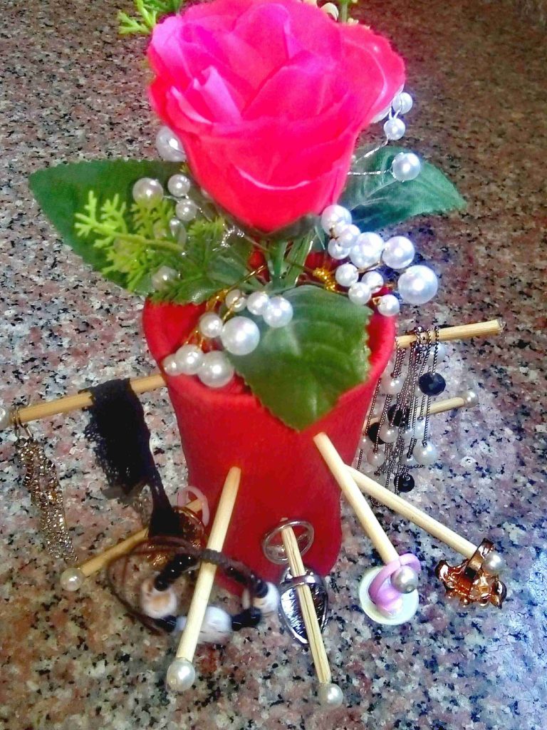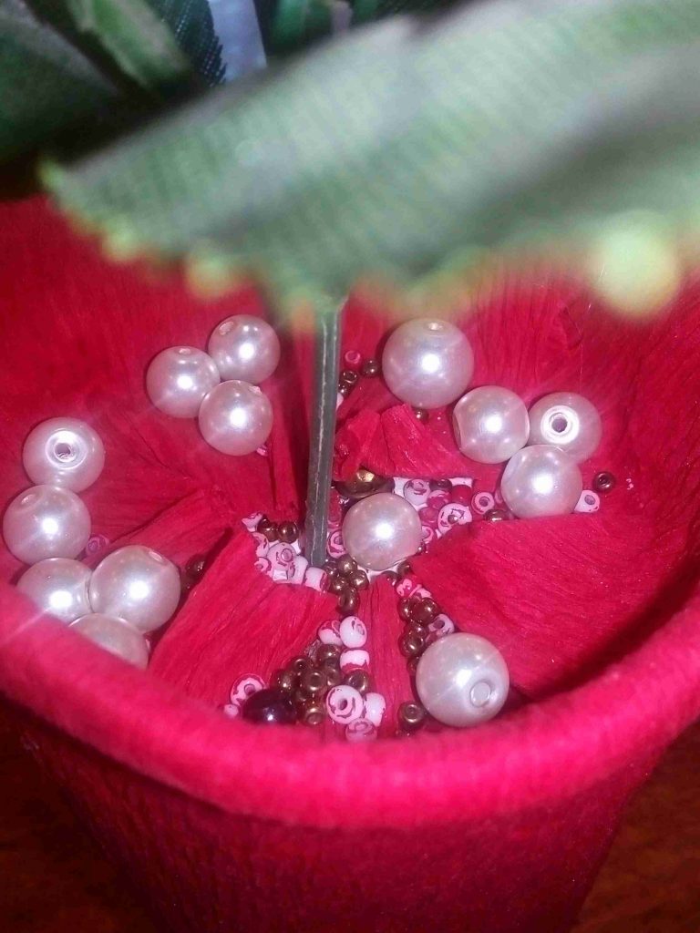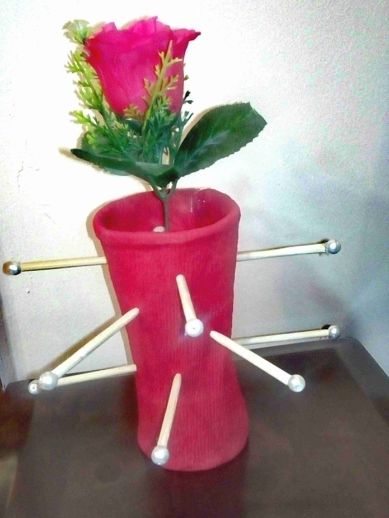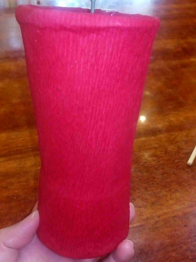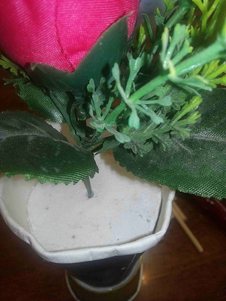 # حطي شوية جبس مع مي وعبي الكأس اللي من الاعلى ليثقل معنا ويتحمل وزن. وازرعي فيه وردة صناعية.