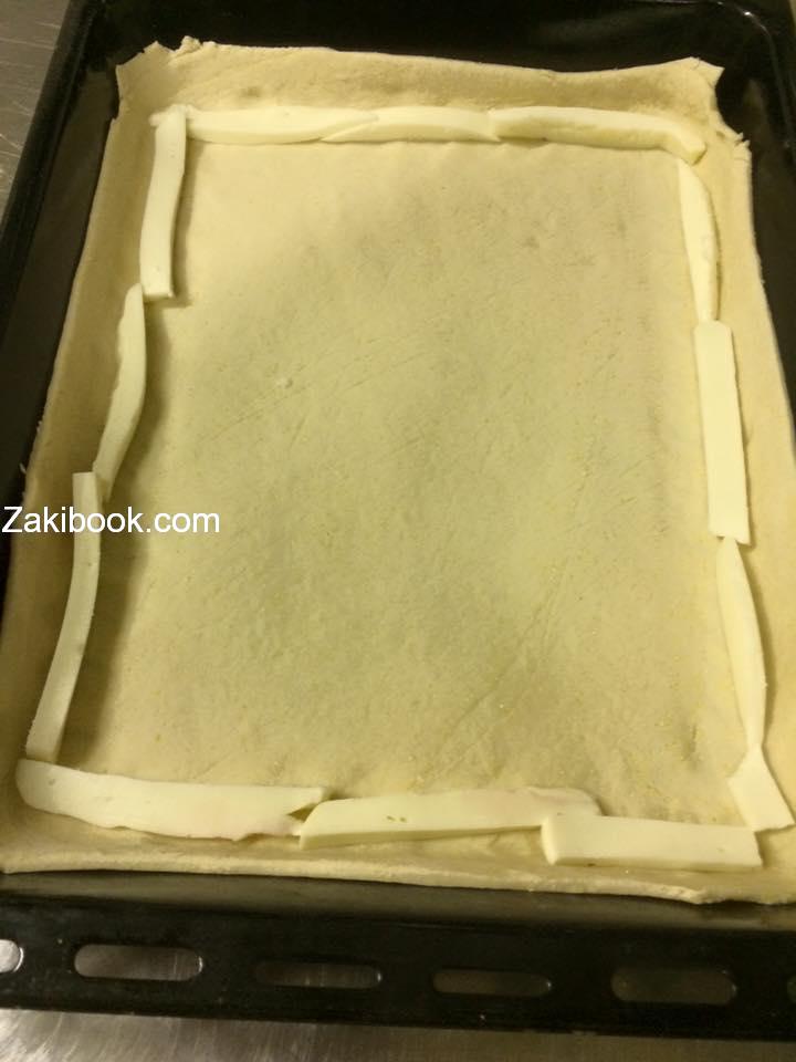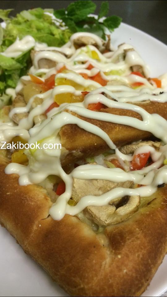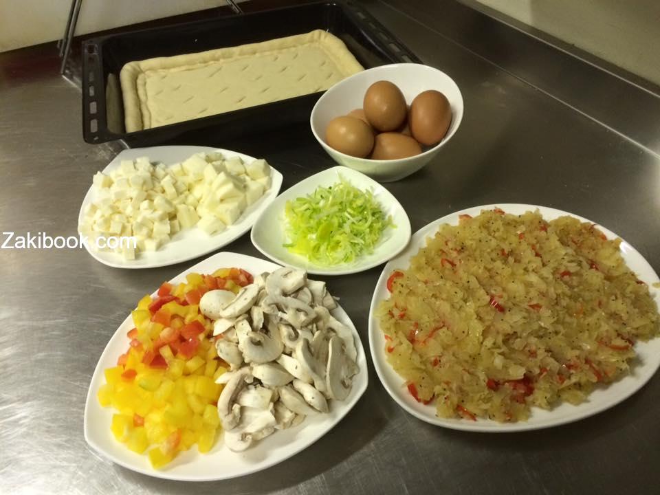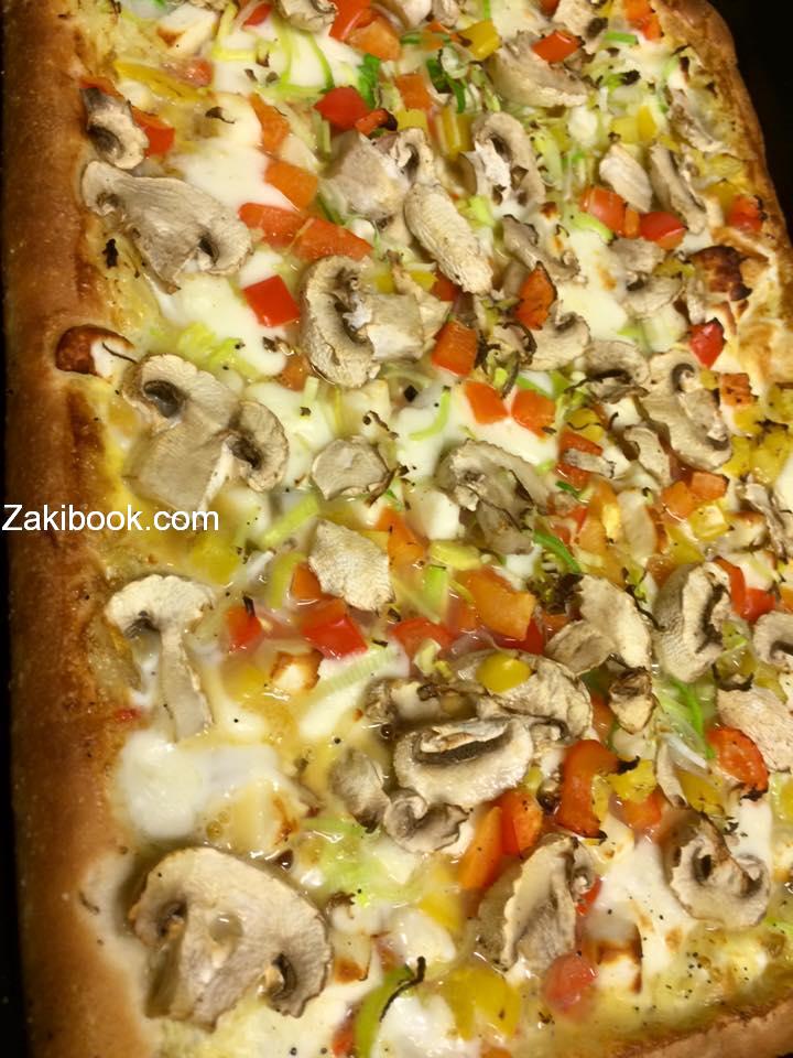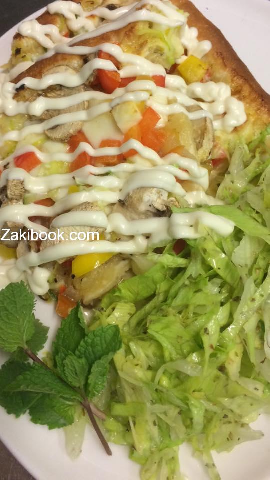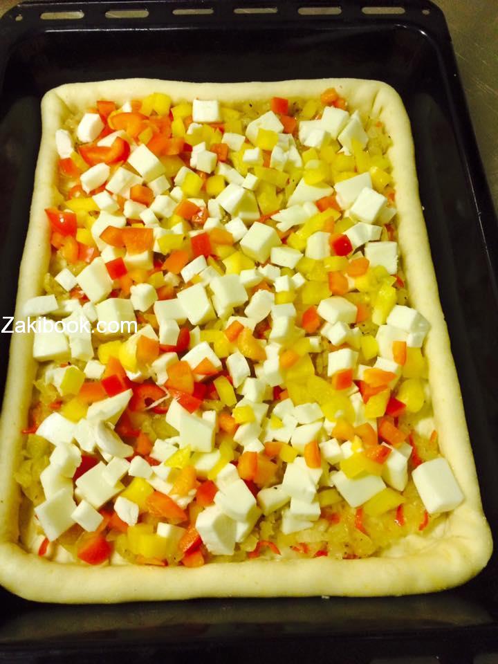 – نضع صينية الفرن و ندهن زيت و ثم نضع العجين و ثم نحشي الطراف جبنة و نغطي و ثم نضع البصل المقلي و بعد جميع الخضار مع جبنة و ثم نضع البيض و نغطي في ورق سلفان و يوضع بالفرن مدة 7 دقائق و ثم يرفع السلفان وتشوى من الأعلى حتى يصبح اللون ذهبي و هكذا يصبح جاهز و يقدم مع سلاد خس مع اوريكانو,و يوضع المايونيز على اومليت.