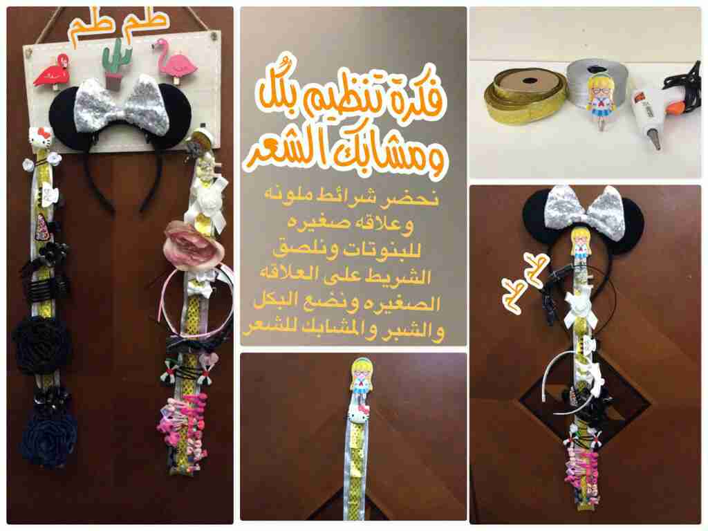 حبيباتي هاي الفكره بسيطه وسهله جدا عباره عن شريط ملصق على علاقه صغيره بشكل جميل وممكن عمل اكثر من شريط لتنظيم بكل ومشابك الشعر وطواق للبنوتات الأمامير وجميع المواد المستخدمه بسيطه و موجوده ومتوفره بكل بيت