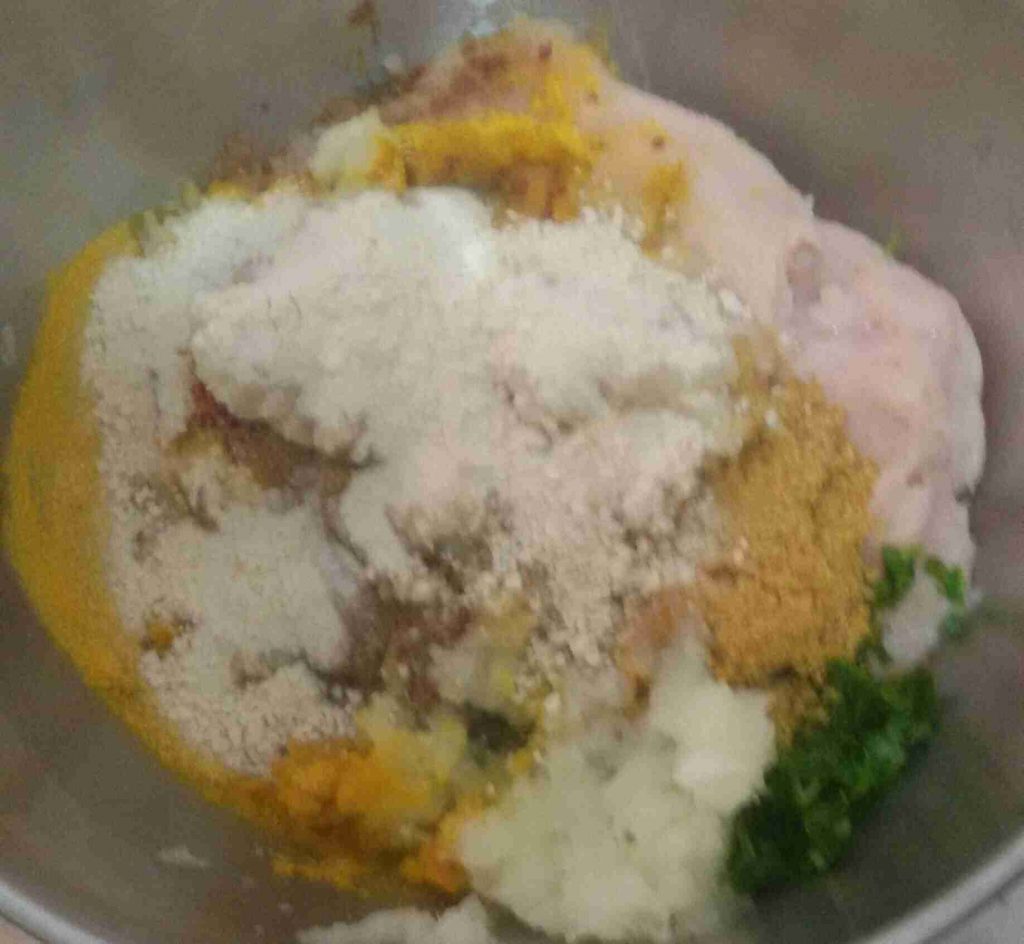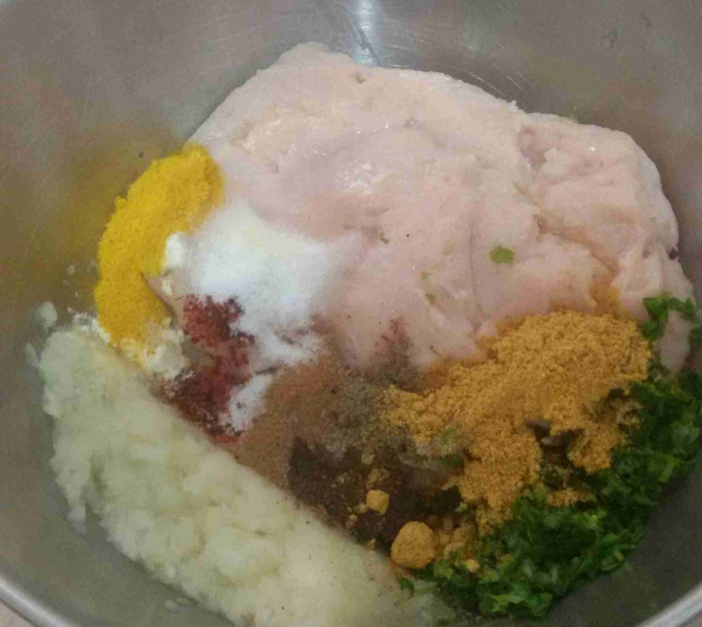 للكفتة اللذيذة (صدور دجاج + بصل + بقدونس) وكلهم مفرومين ناعم + بهار جاج وملح وفلفل وبابريكا وهيل وقرفة مطحونين + شوية بكصمات