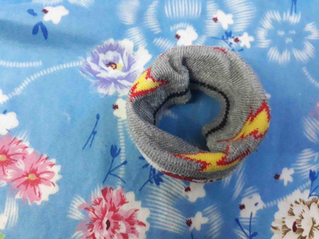 نأخذ جوراب ونقص طرفه من جهة الاصابع ثم نقلبه ونبرم من الجهة المقصوصة الى ان نحصل على دونات مرتبة….